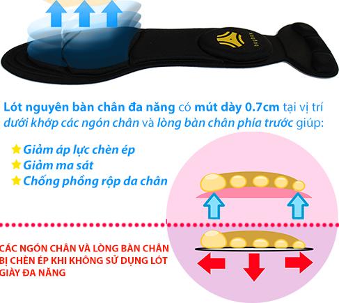 - Số 1. Lót mũi giày đệm êm ngón chân giúp giảm ma sát giữa ngón chân với chât liệu giày cứng; giúp giảm đau thốn móng chân khi chân bị chúi về phái trước lúc mang giày cao gót; đặc biệt chuyên dùng cho bàn chân ngắn/ bàn chân to bề ngang mang giày có mũi dài/ mũi nhọn/ mũi vuông được dễ dàng hơn.