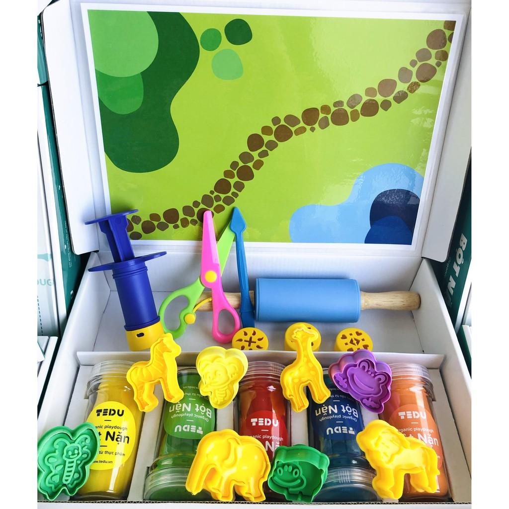 - tấm bìa chơi bột nặn theo chủ đề - khơi gợi sáng tạo cho bé trong khi chơi Bạn thân mến, TEDU thật sự rất vui khi bạn quan tâm đến đồ chơi an toàn mang tính giáo dục và khuyến khích sự sáng tạo của bé. Nguyên liệu: Hướng dẫn bảo quản Đậy kín nắp hộp sau khi chơi, bảo quản ở nhiệt độ phòng cho thời gian chơi tốt nhất là 6 tháng sau ngày sản xuất. Hướng dẫn sử dụng Bột sau khi lấy ra khỏi hộp cần được nhào nhẹ 30 giây để đạt độ mịn tuyệt đối trước khi chơi. Chơi bột nặn trên mặt phẳng trơn như bàn gỗ, nhựa hoặc mica, không cán bột nặn lên giấy. Hướng dẫn khôi phục bột cũ Bột sau thời gian chơi lâu có dấu hiệu mềm quá, bạn rắc 1 lượng nhỏ bột mì và vài giọt dầu ăn rồi nhào lại. Nếu bột để quên bên ngoài và bị khô nhẹ, bạn nhỏ 1 vài giọt nước và nhào lại. Nếu để khô lâu lớp ngoài bị khô cứng, bạn tháo lớp ngoài và bỏ, bột bên trong vẫn mềm có thể chơi được bình thường.