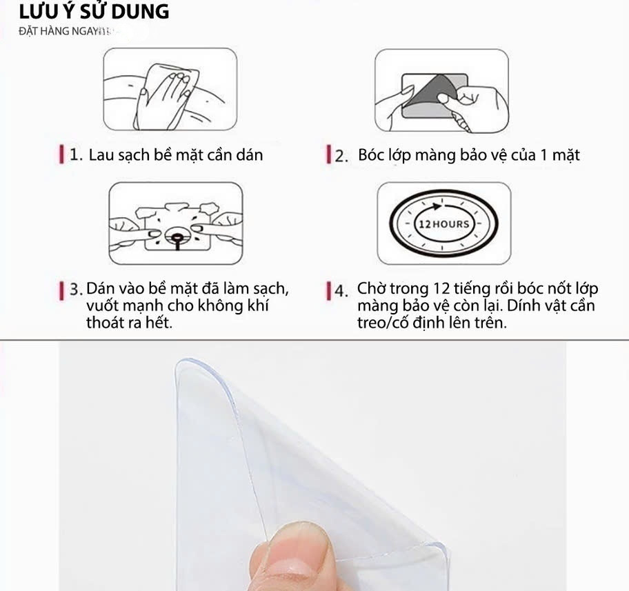 Mô tả sản phẩm Tấm keo trong 2 mặt đa năng được sử dụng nhiều trong đời sống hàng ngày. Đặc biệt có thể rửa sạch và sử dụng lại. Không để lại vết keo sau khi tháo ra khỏi bề mặt dán. Tính năng chống nước, chống lão hóa, có thể sử dụng trong nhiều năm. Có thể cắt nhỏ tùy ý phù hợp nhiều mục đích sử dụng. Cách sử dụng: lau sạch bề mặt, đảm bảo bề mặt không dính bụi, dán một mặt vào và đợi 12 tiếng để dính hẳn rồi mới dán lên bề mặt kia. Bề mặt không dùng được: Tường sơn, quét vôi, bề mặt có vân hoặc không bằng phẳng.