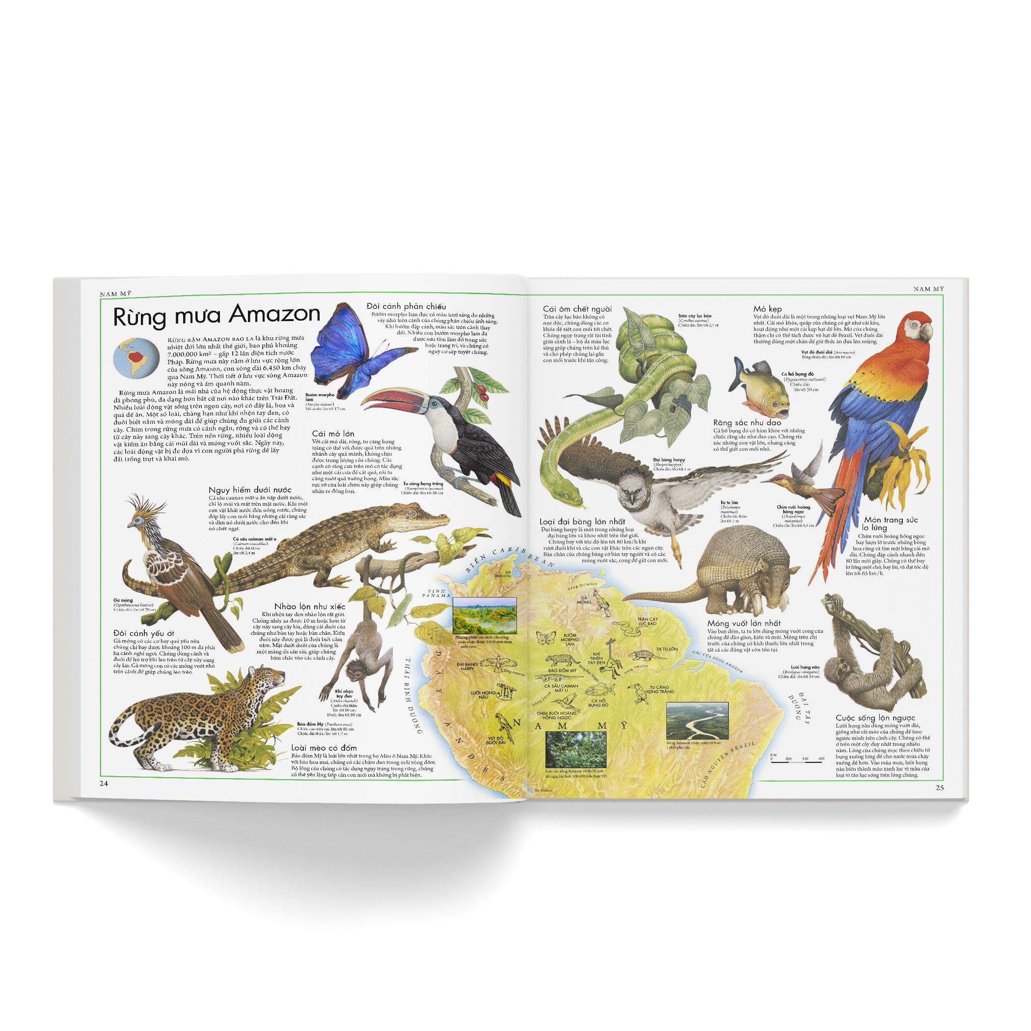 Với cuốn sách này, các bạn đọc nhỏ được thỏa sức khám phá các châu lục và quốc gia trên thế giới, từ vùng Bắc Cực lạnh giá đến các hoang mạc phía tây, sang dãy Andes, rừng mưa Amazon hay vùng Siberia… Mỗi vùng đất lại có điều kiện địa lý, khí hậu khác nhau; cùng với đó là các loài thú, chim, bò sát, cá và côn trùng đặc trưng ở từng khu vực… Các em hãy cùng tìm hiểu các loài sinh vật khác nhau trên thế giới sống ở đâu, môi trường sống của các loài này như thế nào, chúng tồn tại trong khí hậu rất nóng hay rất lạnh ra sao… Rất nhiều điều thú vị đang chờ em khám phá trong cuốn sách này nhé!