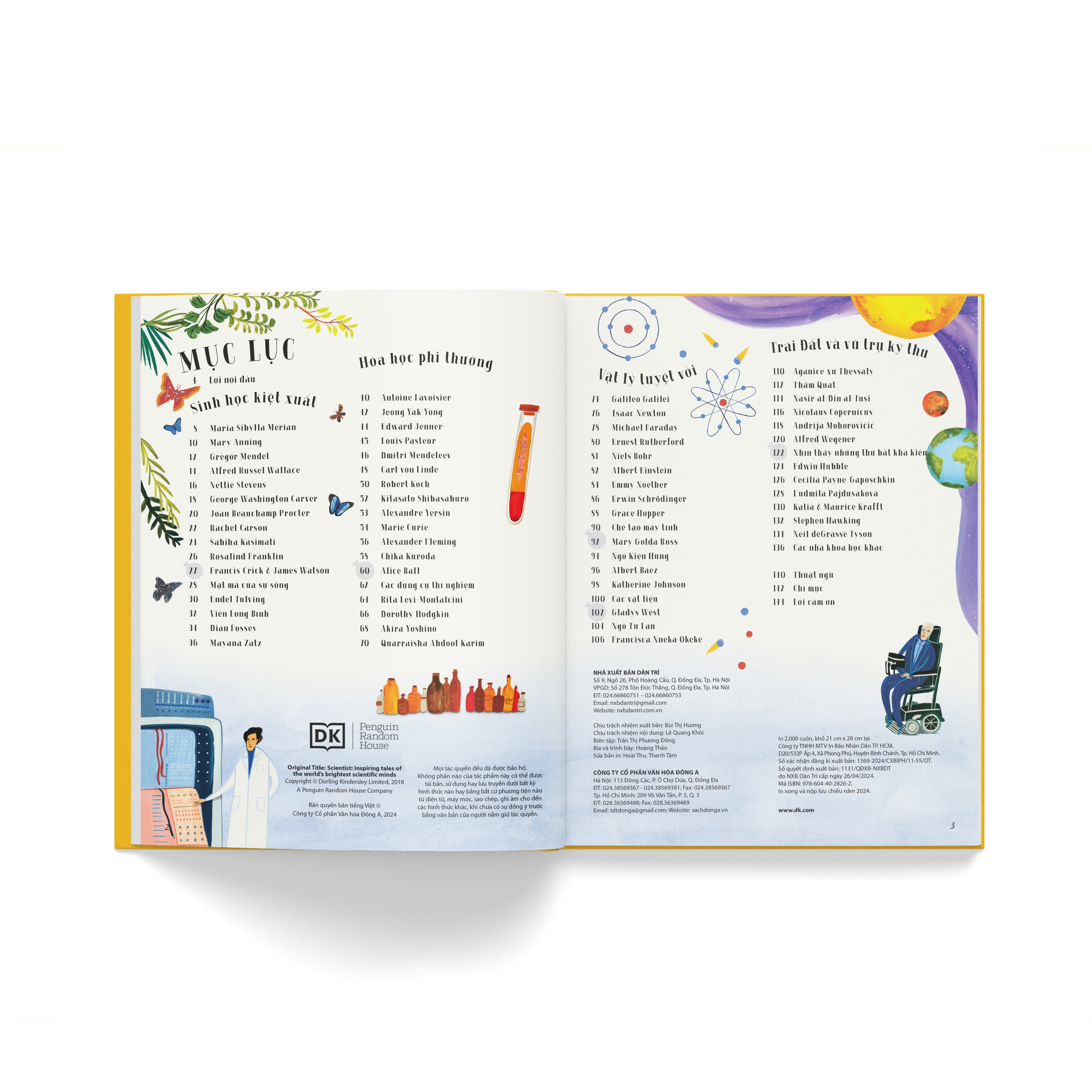 Nhà khoa học - Những câu chuyện truyền cảm hứng từ những nhà khoa học lỗi lạc nhất thế giới kể về cuộc đời của hơn 50 nhà khoa học kiệt xuất, những người đã thay đổi thế giới bằng bộ óc tò mò và khát khao vươn đến tri thức của mình. Sách được chia thành 4 chương tương đương với 4 lĩnh vực: Sinh học kiệt xuất, Hóa học phi thường, Vật lý tuyệt vời, Trái đất và vũ trụ kỳ thú. Chúng ta sẽ gặp gỡ và tìm hiểu về cuộc đời của Marie Curie, Alexandre Yersin, Galileo Galilei, Albert Einstein, Stephen Hawking cùng nhiều nhà khoa học nổi tiếng khác.