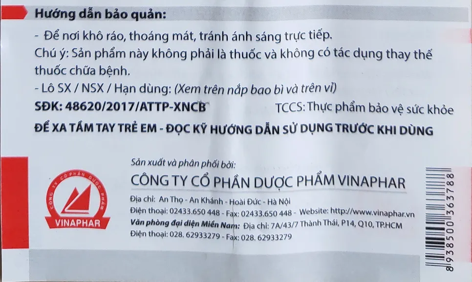 Phụ gia: (tinh bột sắn, lactose, mgstearate) vđ ....1 viên