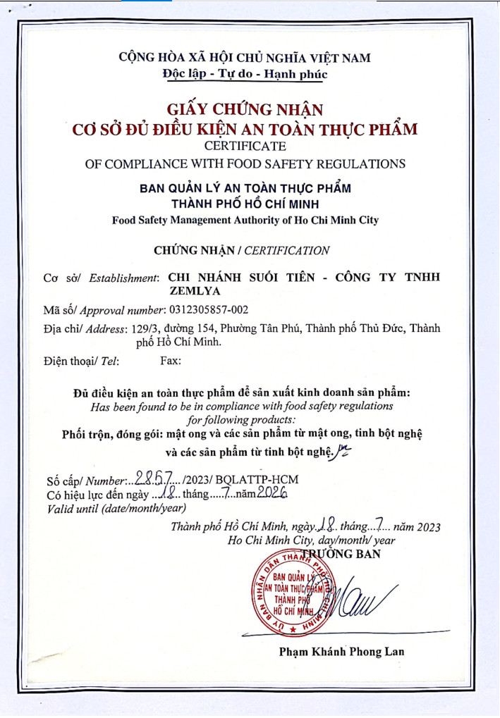 - Sản phẩm có Hồ sơ công bố, đạt tiêu chuẩn An toàn vệ sinh thực phẩm theo quy định về An toàn vệ sinh thực phẩm Việt Nam.