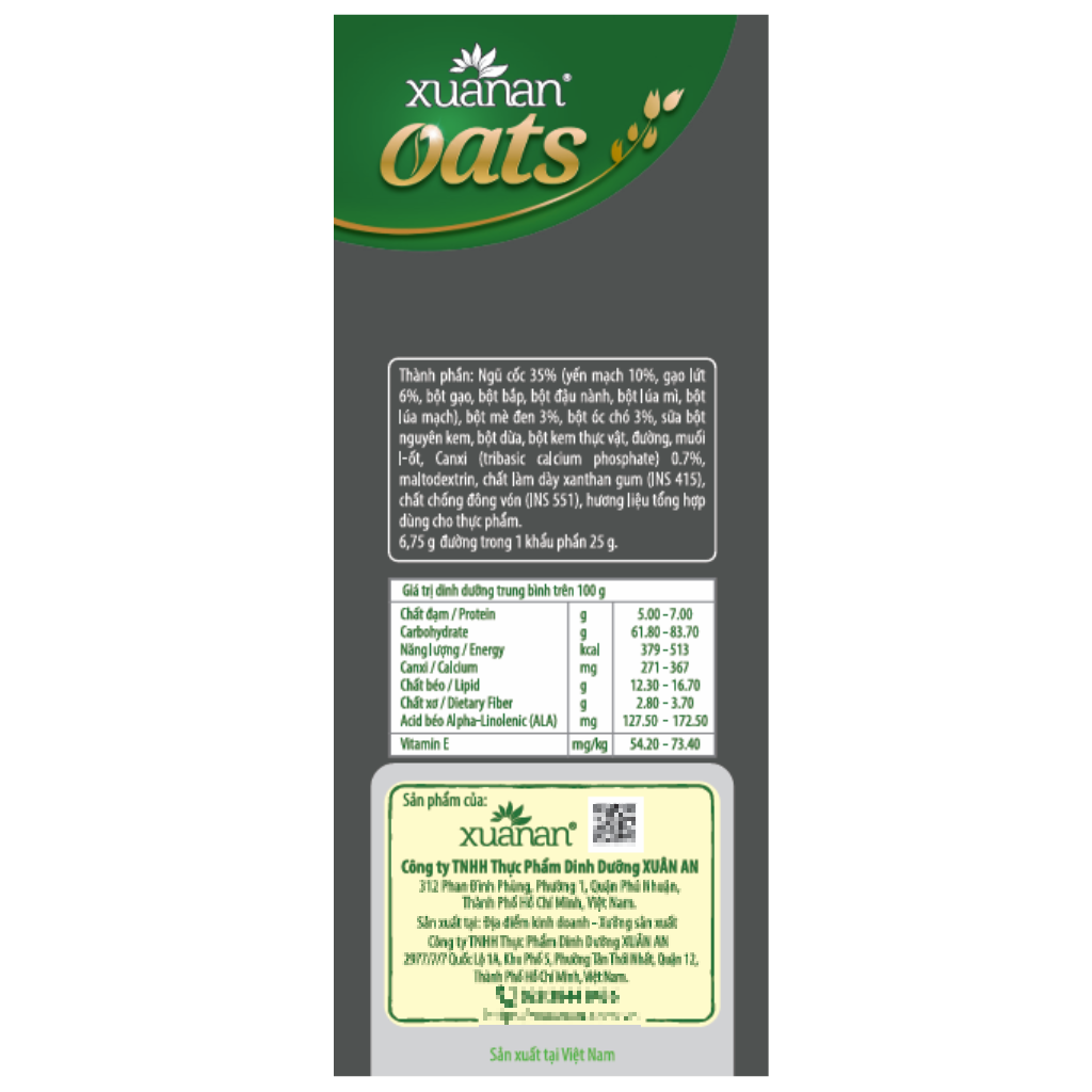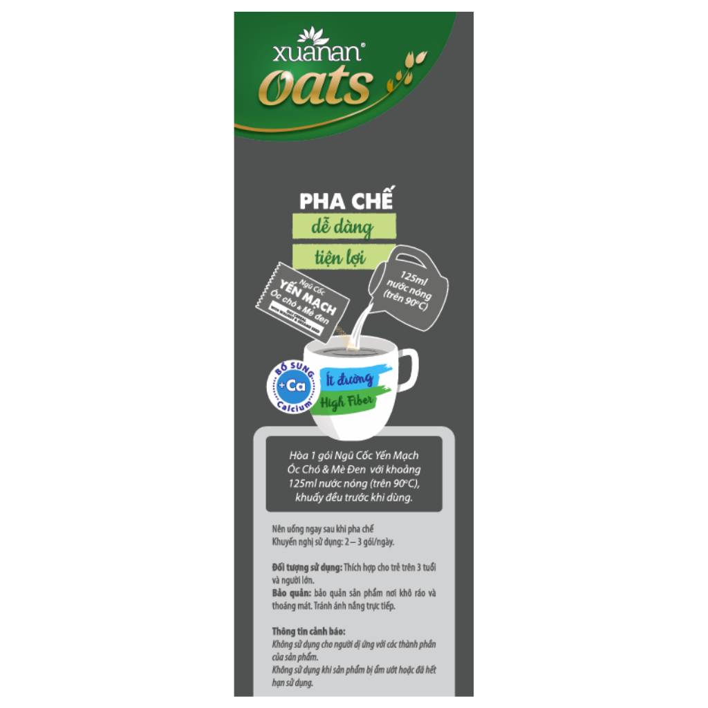 Combo NC Óc Chó Mè Đen 400gr (25G16 GÓI) + YM Hạnh Nhân Hạt Chia 400gr (25G16 GÓI) + Gạo Lức Huyết Rồng 400gr (25G16 GÓI) + Dinh Dưỡng Canxi 400gr (25G16 GÓI) +NC Yến Mạch 400gr (25G*16 GÓI) [ít đường] Yến Mạch, Óc chó và Mè đen là ba loại hạt được dùng khá phổ biến đối với mỗi gia đình vì chúng có tác dụng rất tốt cho sức khỏe. Đặc biệt, chúng phù hợp sử dụng với nhiều lứa tuổi, ngay cả trẻ nhỏ. Khi kết hợp 3 nguyên liệu này trong chế biến ngũ cốc thì chúng là loại ngũ cốc “Ngũ cốc Yến mạch, Óc chó và Mè đen” siêu hương vị thơm ngon, dinh dưỡng, ngậy béo nhưng không ngấy. Ngũ cốc YẾN MẠCH Hạnh nhân Hạt chia giàu dinh dưỡng và năng lượng, được làm từ yến mạch và nhiều loại ngũ cốc, ngoài ra còn có Hạnh nhân và Hạt chia là hai dưỡng chất chuyên biệt. Sản phẩm được bổ sung thêm can xi và sử dụng ít đường. Vitamin, chất xơ và đạm tự nhiên là nguồn dinh dưỡng tốt cho sức khỏe. Thành phần: Ngũ cốc 35% (Yến mạch 10%, bột gạo lứt 6%, bột gạo, bột bắp, bột đậu nành, bột lúa mì, bột lúa mạch), Hạt chia 3%, bột Hạnh nhân 3%, sữa bột nguyên kem, bột dừa, bột kem thực vật, đường, muối i-ốt, Canxi 0.7%, maltodextrin, chất là dày xanhthan gum (E415), chất chống đông vón (E551), hương liệu tổng hợp dùng cho thực phẩm. 6.75 gr đường trong khẩu phần 25g. Ngũ cốc DINH DƯỠNG can xi được làm từ rất nhiều loại ngũ cốc bằng công thứ đặc biệt. Sản phẩm được bổ sung Can xi giúp ngăn ngừa loãng xương và sử dụng ít đường. Vitamin, chất xơ và đạm tự nhiên là nguồn dinh dưỡng tốt cho sức khỏe. Thành phần: Ngũ cốc 32% (Yến mạch 10%, bột gạo lứt 5%, bột gạo, bột bắp, bột đậu nành, bột lúa mì, lúa mạch), sữa bột nguyên kem, bột dừa, bột kem thực vật, đường, muối i-ốt, Canxi 0.7%, maltodextrin, chất là dày xanhthan gum (E415), chất chống đông vón (E551), hương liệu tổng hợp dùng cho thực phẩm. 6.75 g đường trong 1 khẩu phần 25g. Ngũ cốc YẾN MẠCH được làm từ Yến mạch và nhiều loại Ngũ cốc bằng công thứ đặc biệt. Vitamin, chất xơ và đạm tự nhiên đem lại nguồn dinh dưỡng tốt cho sức khỏe. Sản phẩm được bổ sung thêm Can xi và sử dụng ít đường. Thành phần: Ngũ cốc 32% (Yến mạch 10%, gạo, gạo lứt 5%, bắp, đậu nành, lúa mì, lúa mạch), sữa bột nguyên kem, bột dừa, bột kem thực vật, đường, muối i-ốt, Canxi 0.7%, maltodextrin, chất là dày xanhthan gum (E415), chất chống đông vón (E551), hương liệu tổng hợp dùng cho thực phẩm. 7g đường trong 1 khẩu phần 25g. Ngũ cốc GẠO LỨT Huyet rong là thức uống thơm ngon bổ dưỡng, được làm từ gạo lứt, yến mạch và nhiều loại ngũ cốc. Sản phẩm được bổ sung thêm can xi và sử dụng ít đường. Vitamin, khoáng chất, chất xơ tự nhiên giúp hấp thu dinh dưỡng tốt và thanh lọc cơ thể. Thành phần: Ngũ cốc 32% (gạo lứt huyet rong 10%, yến mạch 6%, gạo lứt, gạo nếp cẩm 3%, bắp, đậu nành, lúa mỳ, lúa mạch), bột kem thực vật 29%, đường, đường ăn kiêng Isomalt, sữa tách béo 7%(Instant Skim Milk Powder &%), bột dừa, Canxi 0.7%, Muối I-ốt, maltodextrin, chất maltodextrin làm dày xanthan gum (E415), chất chống đông vón (E551), hương liệu tổng hợp dùng cho thực phẩm. 6.5 g đường trong khẩu phần 25g Đối tượng sử dụng: Trẻ từ 3 tuổi trở lên và người lớn, người ăn theo chế độ giảm đường. Hướng dẫn sử dụng: Hòa 1 gói Ngũ cốc YẾN MẠCH Hạnh nhân Hạt chia với khoảng 125ml nước sôi, khuấy đều trước khi dùng. Dùng 2-3 gói mỗi ngày Bảo quản: Bảo quản nơi khô ráo, thoáng mát; tránh tiếp xúc trực tiếp với không khí và ánh nắng mặt trời. Thông tin cảnh báo: Không dùng khi sản phẩm bị rách, mốc hoặc đã hết hạn sử dụng Sản phẩm của: Công ty TNHH Thực Phẩm Dinh Dưỡng Xuân An