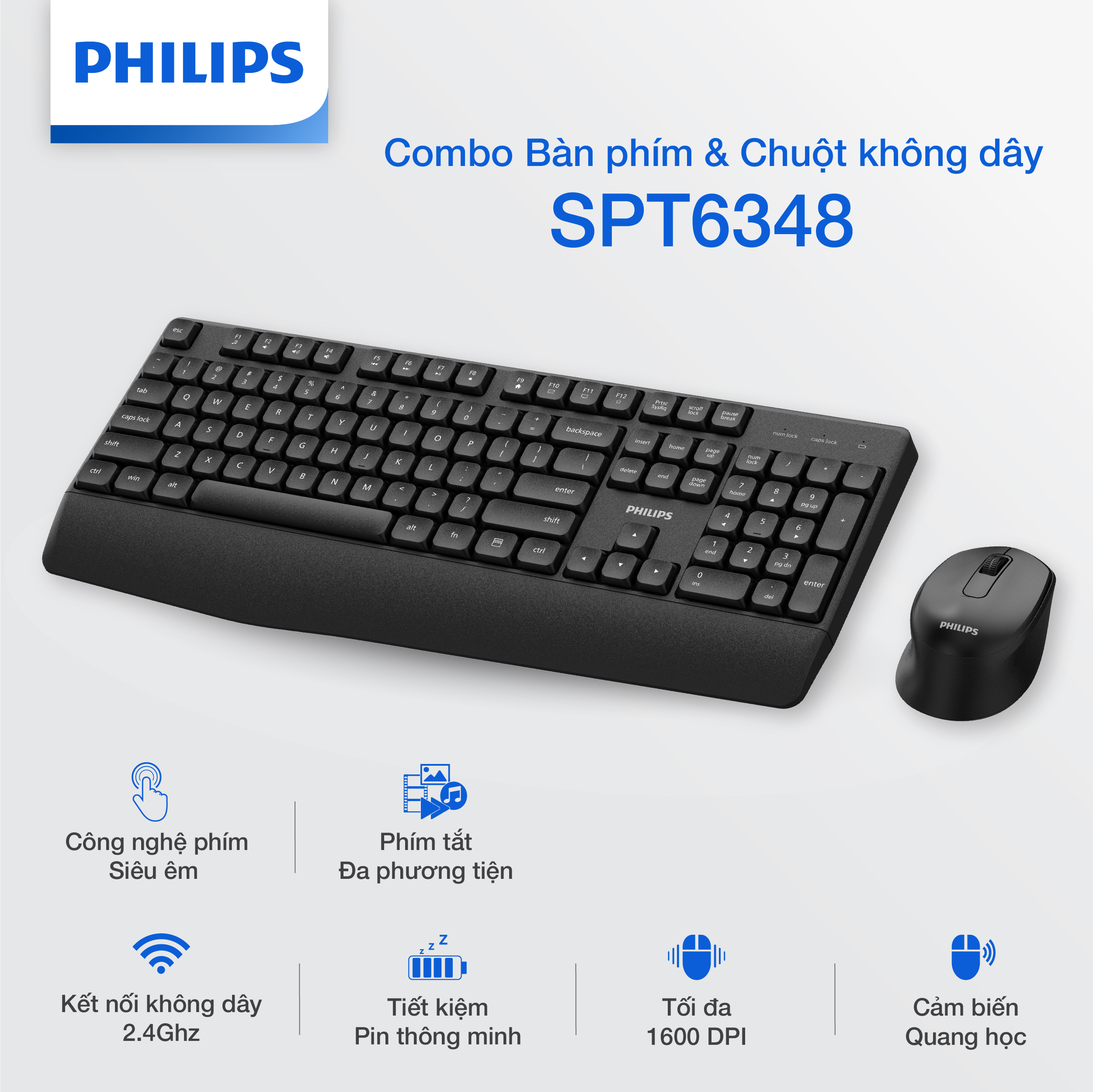 ️Combo không dây Philips SPT6338– Nhẹ, êm, thời trang & siêu bền Thiết kế siêu mỏng, tối giản – đẹp hiện đại, tiết kiệm không gian Kết nối không dây 2.4GHz ổn định – khoảng