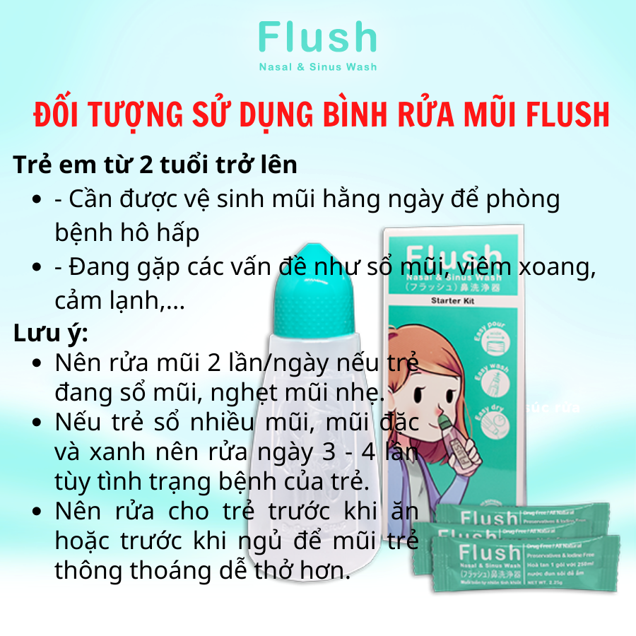 - Có tác dụng sát khuẩn đường hô hấp hiệu quả. HƯỚNG DẪN BÌNH RỬA MŨI FLUSH Bước 1: Rửa tay và bình rửa mũi sạch sẽ trước khi sử dụng Bước 2: Cắt gói muối sinh lý và đổ vào bình Bước 3: Rót nước cất, nước lọc hoặc nước đun sôi để ấm vào bình ở mức 250ml. Bước 4: Vặn chặt nắp bình và lắc cho muối tan hết. Bước 5: Cúi người, nghiêng đầu trước bồn rửa, nhẹ nhàng đưa đầu có lỗ trên nắp bình vào mũi Bước 6: Há miệng, nhẹ nhàng bóp chai theo từng nhịp. Bước 7: Lặp lại với bên mũi còn lại khi dung dịch còn một nửa. Sản phẩm bình rửa mũi Flush là sản phẩm được 96% bà mẹ Thái Lan tin dùng. Cảm ơn quý khách đã tin tưởng và lựa chọn sản phẩm bình rửa mũi của FLUSH NASAL