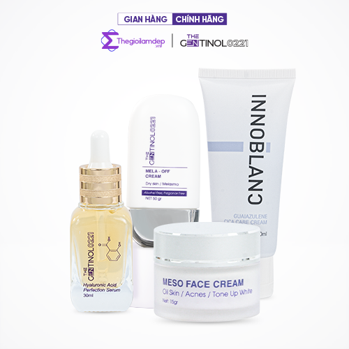 Combo Dưỡng Trắng, Căng Bóng Da, Chống Lão Hoá The Gentinol 0221 ĐỐI TƯỢNG SỬ DỤNG Phù hợp với tất cả các loại da Không dùng cho phụ nữ đang mang thai   THÀ̀NH PHẦN CHÍNH 1. Kem phân hủy sắc tố da Mela Off Cream The Gentinol 0221 2. Tinh chất siêu phân tử HA The Gentinol 0221 3. Kem Meso tái tạo da The Gentinol 0221 4. Kem phục hồi tái tạo làn da Innoblanc Cica Care   CÔNG DỤNG CHÍNH 1. Kem phân hủy sắc tố da Mela Off Cream The Gentinol 0221 - Giảm nếp nhắn - Hỗ trợ hiệu quả việc duy trì độ đàn hồi của da - Giúp giảm sự xuất hiện của nếp nhăn - Làm đều màu da - Dưỡng da trắng sáng và mịn màng - Giải quyết sắc tố trên da và giãn mao mạch song hành - Tác dụng kép: Ức chế enzyme tyrosinase & Peroxidase, ức chế Polyme hóa Indole, Chelat ion đồng và sắt, tăng glutahione nội bào, chống oxy hóa 2. Tinh chất siêu phân tử HA The Gentinol 0221 - Cấp ẩm - Làm mờ vết nhăn da - Hỗ trợ da căng bóng tự nhiên - Thúc đẩy khả năng tự tái tạo, phục hồi và trẻ hóa da - Tăng khả năng hấp thụ oxy, giúp da hoạt động mạnh mẽ, từ đó tăng cường khả năng hấp thụ 8 CÔNG DỤNG ĐEM ĐẾN GƯƠNG MẶT THON GỌN - Se khít lỗ chân lông - Săn chắc da - Cải thiện độ đàn hồi - Giảm nhăn da - Ngăn lão hóa da - Dưỡng da tươi sáng rạng rỡ - Nuôi dưỡng sau bên trong - Cải thiện làn da tối màu 3. Kem Meso tái tạo da The Gentinol 0221 - Da lão hóa, độ đàn hối kém, kết cấu da yếu, không đều màu là do hệ vi sinh trên da đã bị mất cân bằng - Tăng tỉ lệ tổng hợp collagen gấp 300% - Tăng sinh tế bào liên tục, làm chậm tiến trình lão hóa - Tái tạo mô da thông qua việc kích thích sản sinh các protein như collagen, elastin, fibroectin - Cải thiện độ đàn hồi toàn diện: giúp da tái tạo lại 29 nhân tố tăng trưởng, đánh thức các tế bào gốc rơi vào trạng thái ngủ yên 4. Kem phục hồi tái tạo làn da Innoblanc Cica Care - Công thức làm giảm tiến trình oxy hóa mạnh mẽ: bằng cách trung hòa các độc tố, kem phục hồi tái tạo da giúp giải độc da, đồng thời tối ưu hóa chức năng sửa chữa tự nhiên của da và hệ thống phòng thủ - Hỗn hợp chiết xuất từ Axit Hyaluronic phân tử thấp, chiết xuất centella asiatica, Glutathione, Niaciamide; giúp nuôi dưỡng độ ẩm của da, đảo ngược tình trạng mất nước, ô nhiễm, hỗ trợ khôi phục kết cấu trẻ trung và giúp làm mờ đi dấu châm chim, nếp nhăn   HƯỚNG DẪN SỬ DỤNG  1. Dùng theo thứ tự: - Sáng: Tinh chất HA siêu phân tử >Kem phân hủy sắc tố mela off  - Tối 2-4-6: Tinh chất HA siêu phân tử > Kem Cica care cream  - Tối 3-5-7-cn: Tinh chất HA siêu phân tử > Kem meso tái tạo mô da  2. Dùng sau các bước tẩy trang - rửa sửa rửa mặt. Thoa mỏng nhẹ, không thoa lên mụn viêm (nếu có), ban ngày sử dụng thêm kem chống nắng   ƯU ĐIỂ̉M NỔI BẬT Cấp ẩm tầng sâu  Căng bóng da cấp tốc Tái tạo hàng rào bảo vệ Chống Oxy hóa tối ưu Phục hồi hư tổn chuyên biệt
