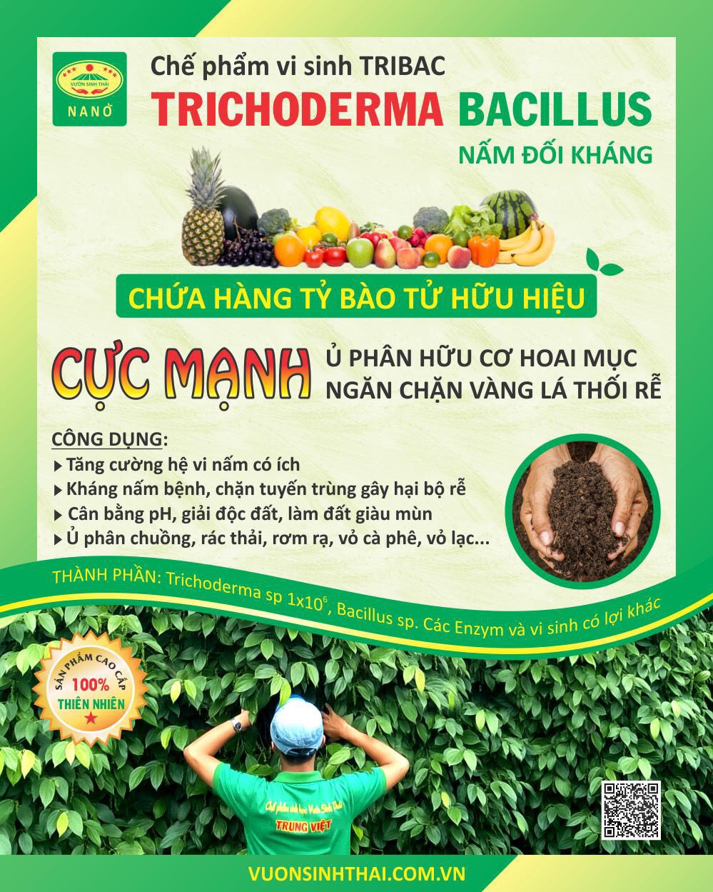Nấm đối kháng trichoderma TRIBAC Dòng Nấm đối kháng trichoderma, bacillus cực mạnh. Khỏi lo tuyến trùng, nấm bệnh. Ủ phân hoai mục nhanh và hiệu quả ! Chế phẩm vi sinh TRIBAC là dòng chế