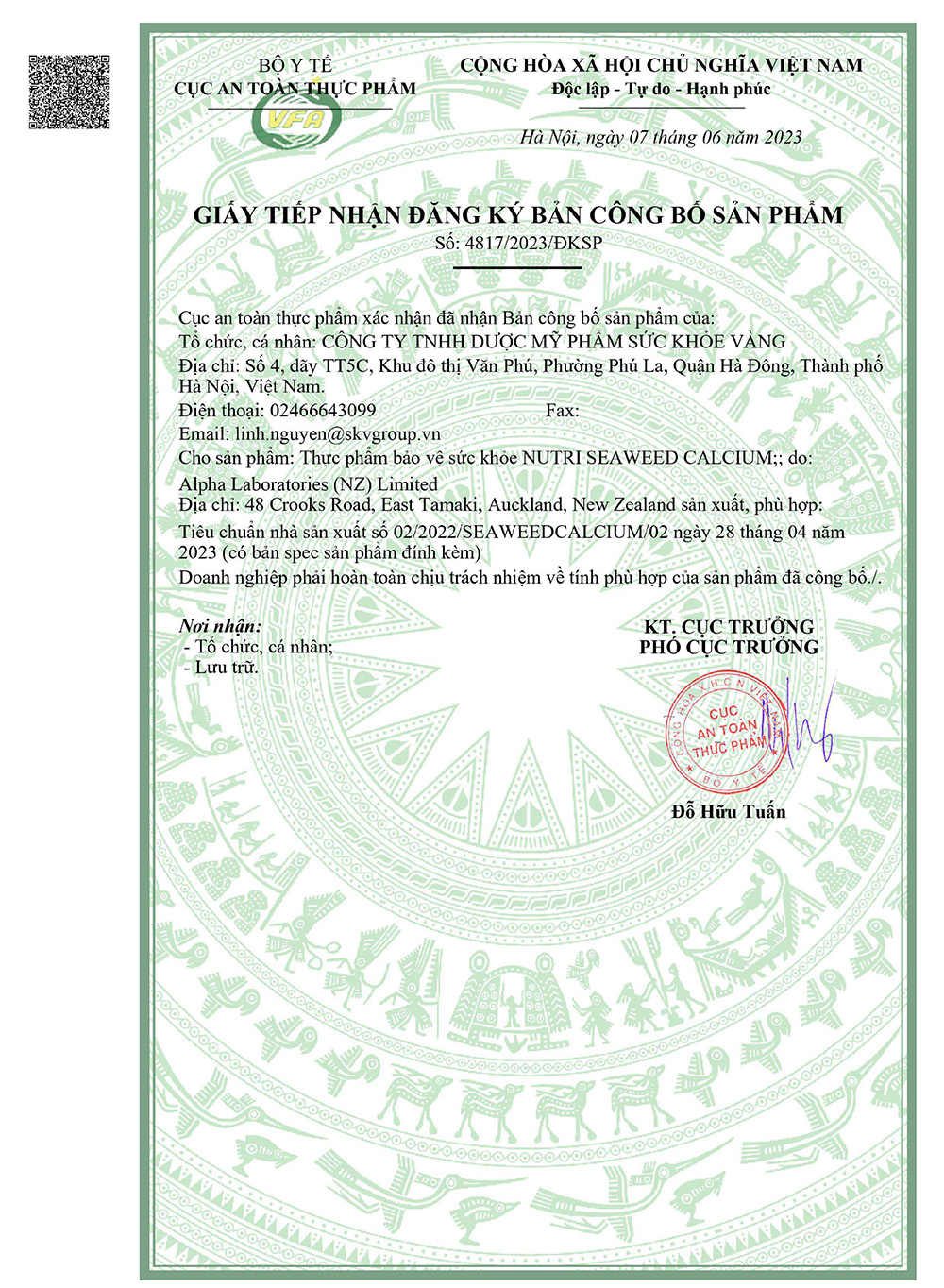 Canxi hữu cơ NUTRI SEAWEED CALCIUM NUTRI SEAWEED CALCIUM là nguồn cung cấp canxi hữu cơ từ tảo biển, kết hợp vitamin K2 và D3 giúp cơ thể hấp thu canxi nhanh hơn, hỗ trợ tăng chiều cao tối ưu và hỗ trợ xương chắc khoẻ. THÀNH PHẦN CANXI HỮU CƠ NUTRI SEAWEED CALCIUM : Tính trong 1 viên