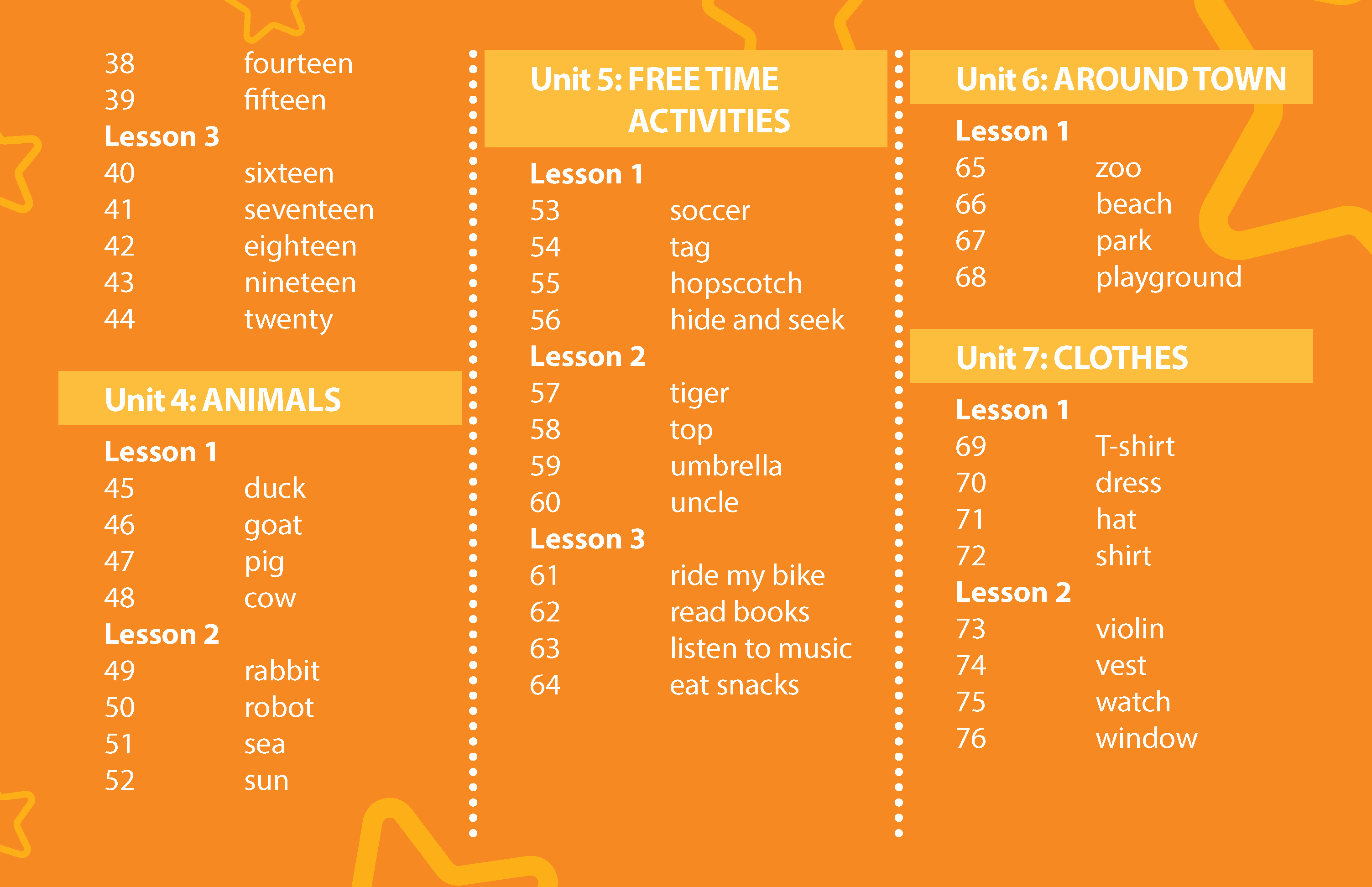 Sách: Learning English 4 - Dành Cho Học Sinh Lớp 4 NỘI DUNG VÀ CẤU TRÚC CỦA QUYỂN SÁCH : Bảng mục lục: Chỉ rõ các mục tiêu chính và trọng tâm của mỗi bài