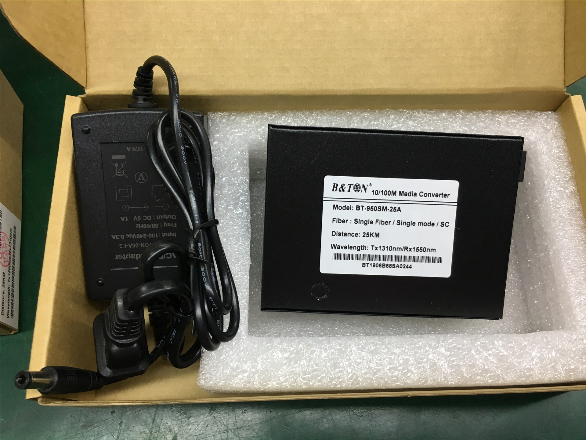 Chuẩn 2 sợi 10/100Base Model: BT-950SM-25 Hãng BTON Bước sóng 131012 Khoảng cách truyền 25km 2 cổng Fiber Single mode chuẩn SC 1 cổng LAN RJ45 Nguồn Input: 110-220VAC-50hZ. Output: 5VDC-1A Hỗ trợ hệ thông