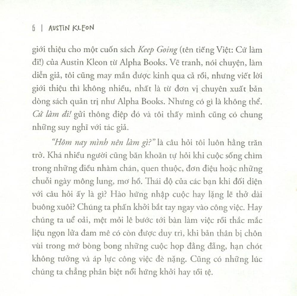 Trong những cuốn sách trước – Steal Like An Artist (Tạm Dịch: Trộm Cắp Như Một Nghệ Sĩ) và Nghệ Thuật PR Bản Thân – Austin đã dạy độc giả cách vay mượn để trở nên sáng tạo và rồi chia sẻ thế nào để được tìm thấy. Trong Cứ Làm Đi!, Austin tiếp tục đưa ra 10 cách để duy trì sự sáng tạo, tập trung và chất riêng của bản thân mình: