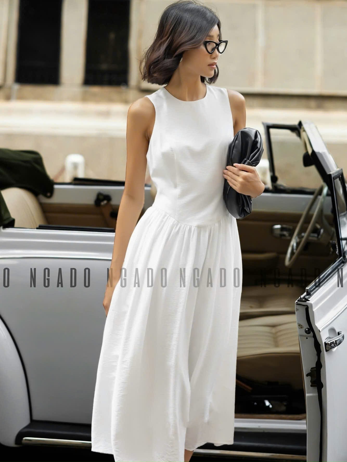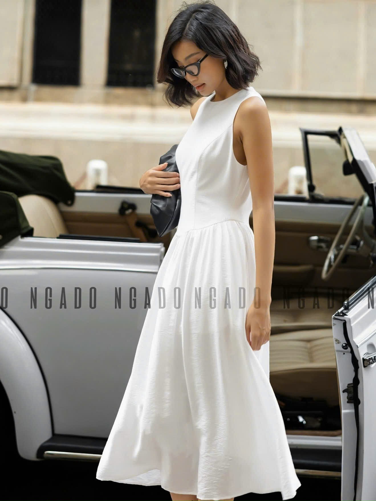 ✨Đầm trắng xoè cổ tròn sát nách NGADO , đầm nữ , Đầm xòe nữ sát nách