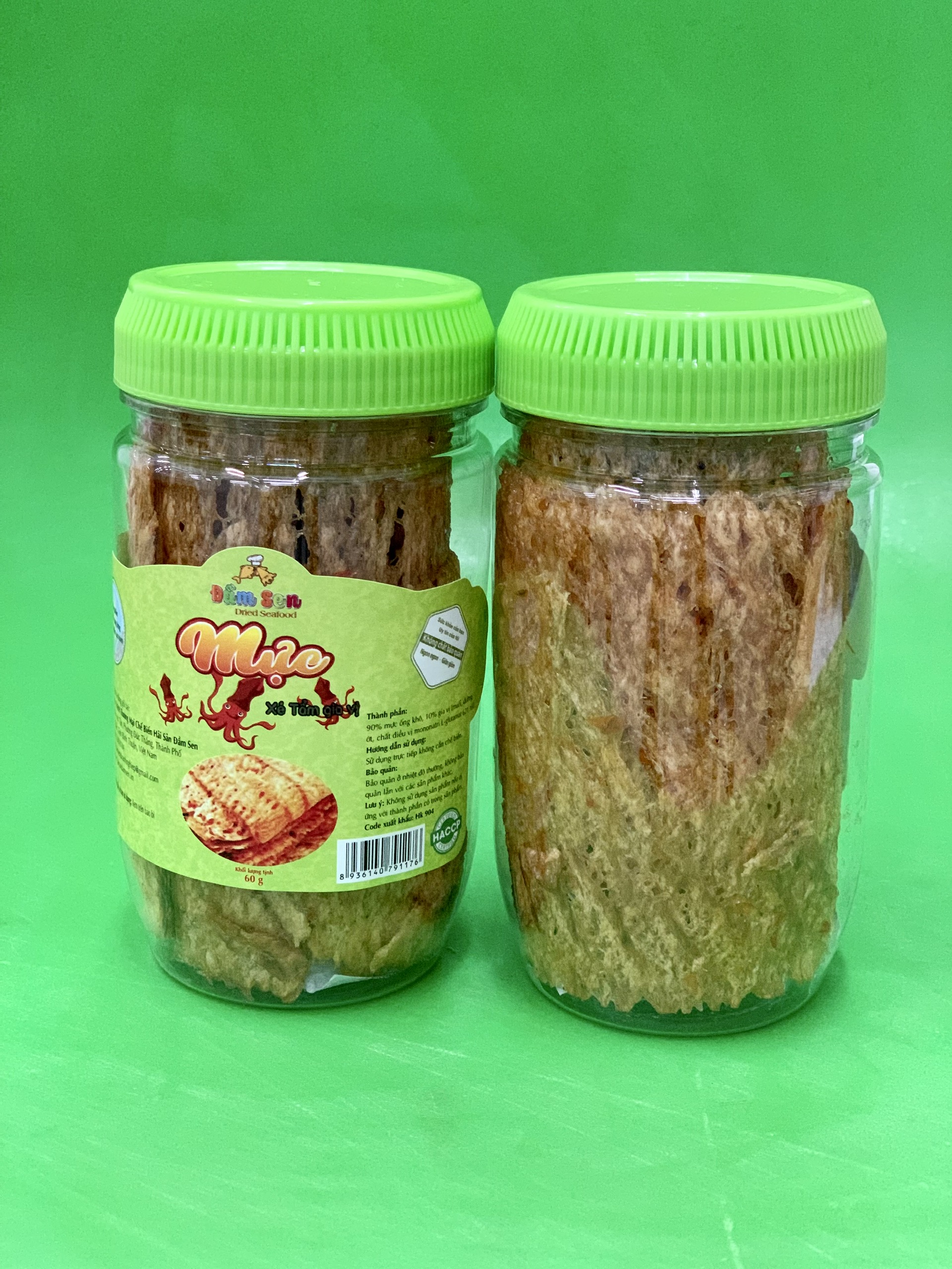 Thành phần: 90% mực khô xé sợi, 2% ớt, 8% gia vị (đường, muối, chất điều vị mononatri L-glutamat 621, hạt nêm Hạn sử dụng: 6 tháng kể từ ngày sản xuất Hướng dẫn sử
