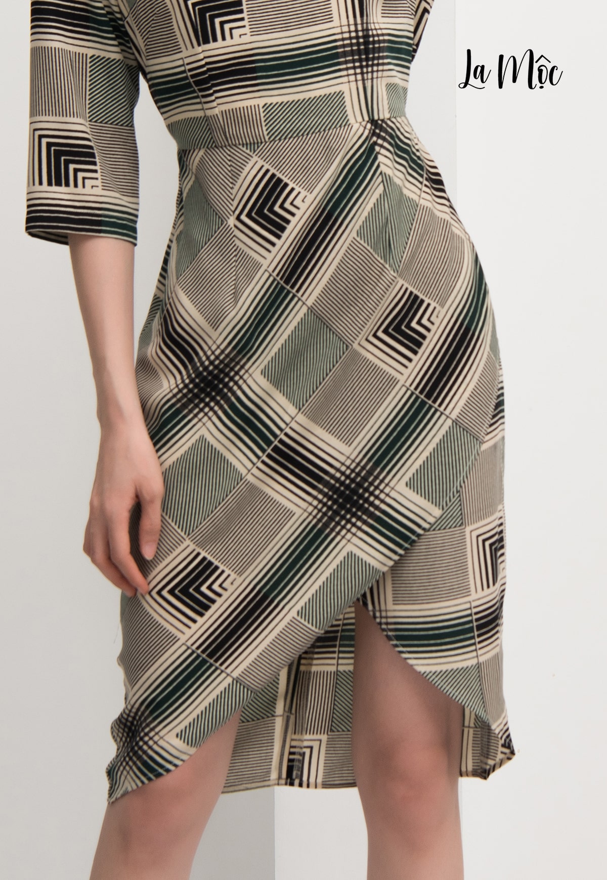 ✨Đầm Công Sở Tay Lở, Đắp Chéo Họa Tiết Ô Vuông Maxivic, La Mộc - LM92108