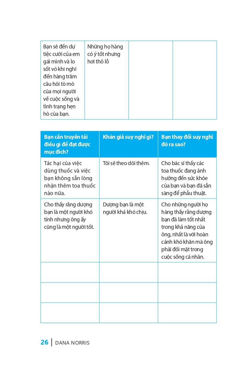 Tác giả Dana Norris viết lại một cách giản dị và nhiều gợi ý dễ hiểu để rút ra những bí quyết đơn giản nhưng hiệu quả trong giao tiếp, giúp người đọc có thể nói chuyện với bất cứ ai, vào bất cứ thời điểm nào, tại bất cứ nơi nào. Ngoài ra, cuốn sách còn nhằm giúp người đọc liên tục trau dồi khả năng giao tiếp, trở thành người kể chuyện, giao tiếp ngày càng tốt hơn