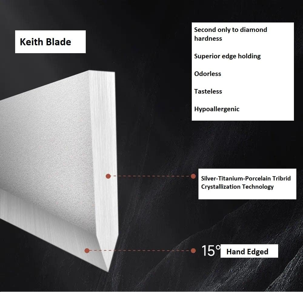 Dao bếp siêu nhẹ Titanium Keith Ti8743 được chế tạo bởi công nghệ kết hợp ba vật liệu bạc-titan-sứ, chỉ đứng sau độ cứng của kim cương, giữ cạnh tốt hơn, không mùi, không vị