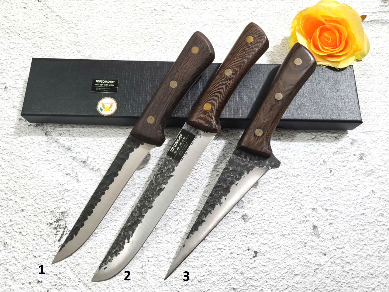 D SỐ 3 : TỔNG DÀI : 26cm, LƯỠI: 13cm,RỘNG : 3.5cm, dày: 2.5mm, CHẤT liệu lưỡi: 5Cr15MOV (thép 5 crom 15 molypden vanadi) Chất liệu CÁN: gỗ Cánh gà, NẶNG : 1.5 lạng