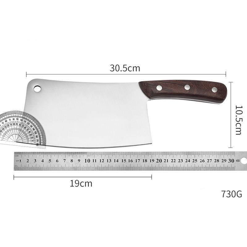THÔNG SỐ KỸ THUẬT Tên sản phẩm: Dao chặt xương bằng thép 4Cr13 cán gỗ. Chất liệu: thép không gỉ 4Cr13 + cán gỗ Màu sắc: trắng bạc + gỗ nâu Kích thước: 30.5 x 10.5 cm, lưỡi dao dài 19 cm Độ dày: 5mm Trọng Lượng: 730g