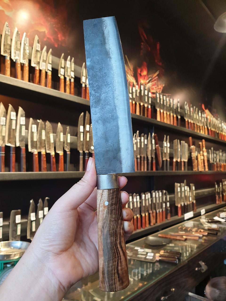 - Chức năng: thái thịt, rau củ quả - Kích thước: Lưỡi: 17cm, cán: 12cm, rộng: 5cm, dầy: 1ly, trọng lượng: 200g - Cán : Gỗ cẩm chỉ, Chốt, Khâu ĐỒNG ĐỎ , keo liên