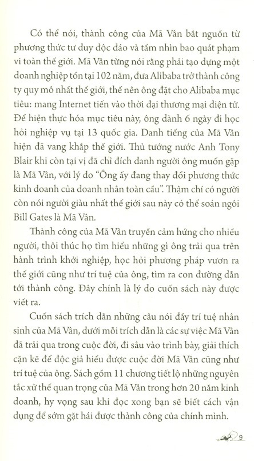 - Giới thiệu Thành công trong lần đầu phát hành cổ phiếu ra công chúng trên thị trường chứng khoán New York, Mã Vân - ông chủ Tập đoàn Alibaba - đã trở thành tỉ phú giàu nhất Trung Quốc. Hẳn bạn tự hỏi tại sao một người học hành không mấy xuất sắc như ông lại có thể leo đến đỉnh vinh quang? Câu trả lời thỏa đáng sẽ đến với bạn khi lần giở từng trang Đạo xử thế của Mã Vân (Jack Ma). Cuốn sách lần đầu tiên tiết lộ 11 nguyên tắc xử thế quan trọng trong hơn 20 năm kinh doanh của Mã Vân. Chính nhờ giữ vững các nguyên tắc này, ông đã vượt qua những thử thách tưởng chừng không thể với người bình thường. Trích dẫn các câu nói bất hủ của Mã Vân đồng thời phân tích tình huống ông áp dụng nguyên tắc, sách mang đến cho bạn nhiều gợi mở thú vị để vận dụng trên hành trình khởi nghiệp của chính mình.