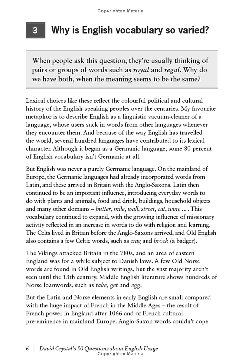David Crystal answers fifty questions about language usage, from general enquiries to specific points of grammar, pronunciation, orthography, vocabulary, idiom, and style. In this compact, user-friendly book, David Crystal draws on his extensive knowledge and experience to answer questions from English language teachers and learners from around the world. The book covers topics ranging from general enquiries about the language as a whole to specific points of grammar, pronunciation, orthography, vocabulary, idiom and style. The author's responses are illustrated by personal anecdotes, placed within historical and literary context and supported by research and corpus data to provide unique, authentic insights.