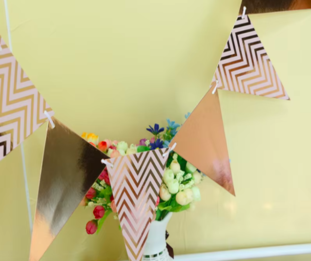 Dây Cờ Tam Giác Ánh Kim Trang Trí Sinh Nhật ➤ Tên sản phẩm: Dây Cờ Treo Trang Trí Tiệc ➤ Chất liệu: Bìa cứng ,Có loại có ánh kim ➤ Số lượng mảnh: 12