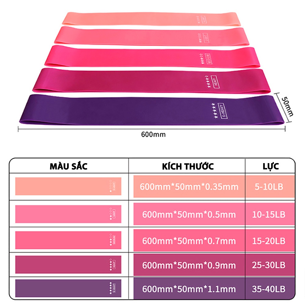 Bộ dây đàn hồi tập thể lực có 5 dây, mỗi dây có mức trọng lượng khác nhau, từ nhẹ tới nặng (8 lbs, 15 lbs, 20 lbs, 25 lbs, 30 lbs) có thể