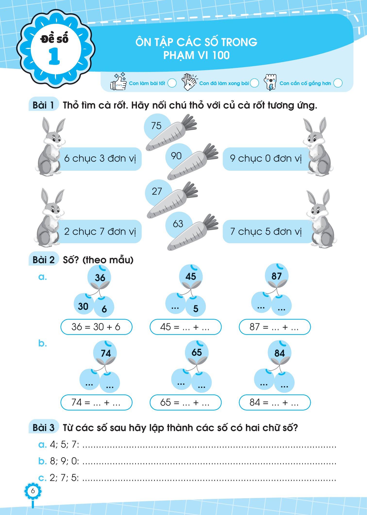 - Sách được chia thành 2 phần rất dễ hiểu cho các bé: Phần đề ôn tập và Phần đề kiểm tra. Phần đề ôn tập: Gồm 15 đề được chia theo các chủ điểm, hoặc chia thành các đề ôn tập theo sát chương trình học trên lớp theo giai đoạn. Phần đề kiểm tra: Gồm 5 đề kiểm tra cuối học kỳ để kiểm tra, đánh giá kiến thức tổng hợp của học sinh.