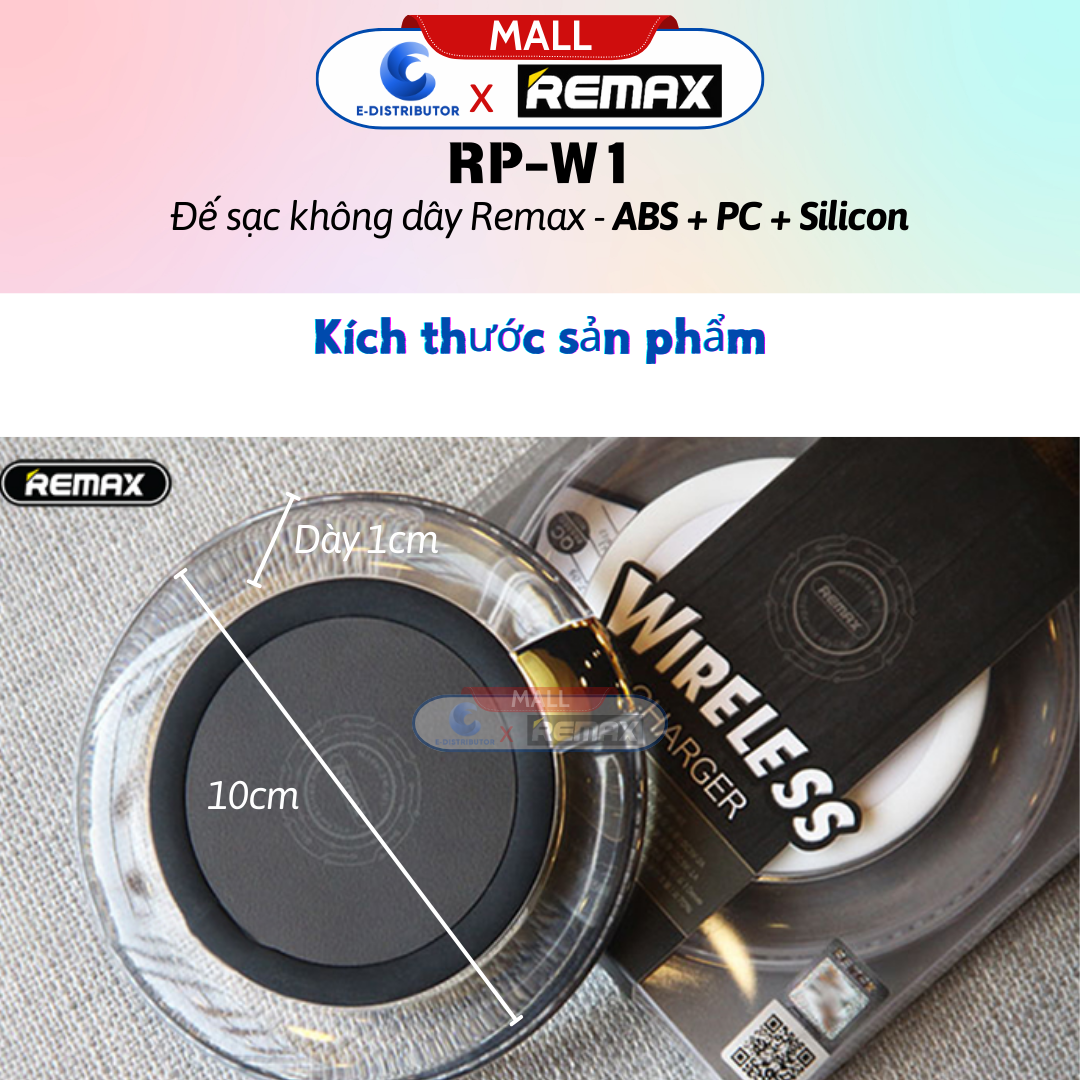 Thông số kỹ thuật Đế sạc không dây Remax RP - W1 Hãng: Remax Model: RP - W1 Chất liệu: ABS + PC + Silicon Đường kính: 100mm Độ dày: 9.5mm Tương thích iPhonee 8, iPhonee 8 Plus, iPhonee X Samsungg S6/S6 edge, S7/S7 Edge, S8/S8 Plus Samsungg Note 5, Note FE, Note 8 Màu sắc: Trắng/ Đen