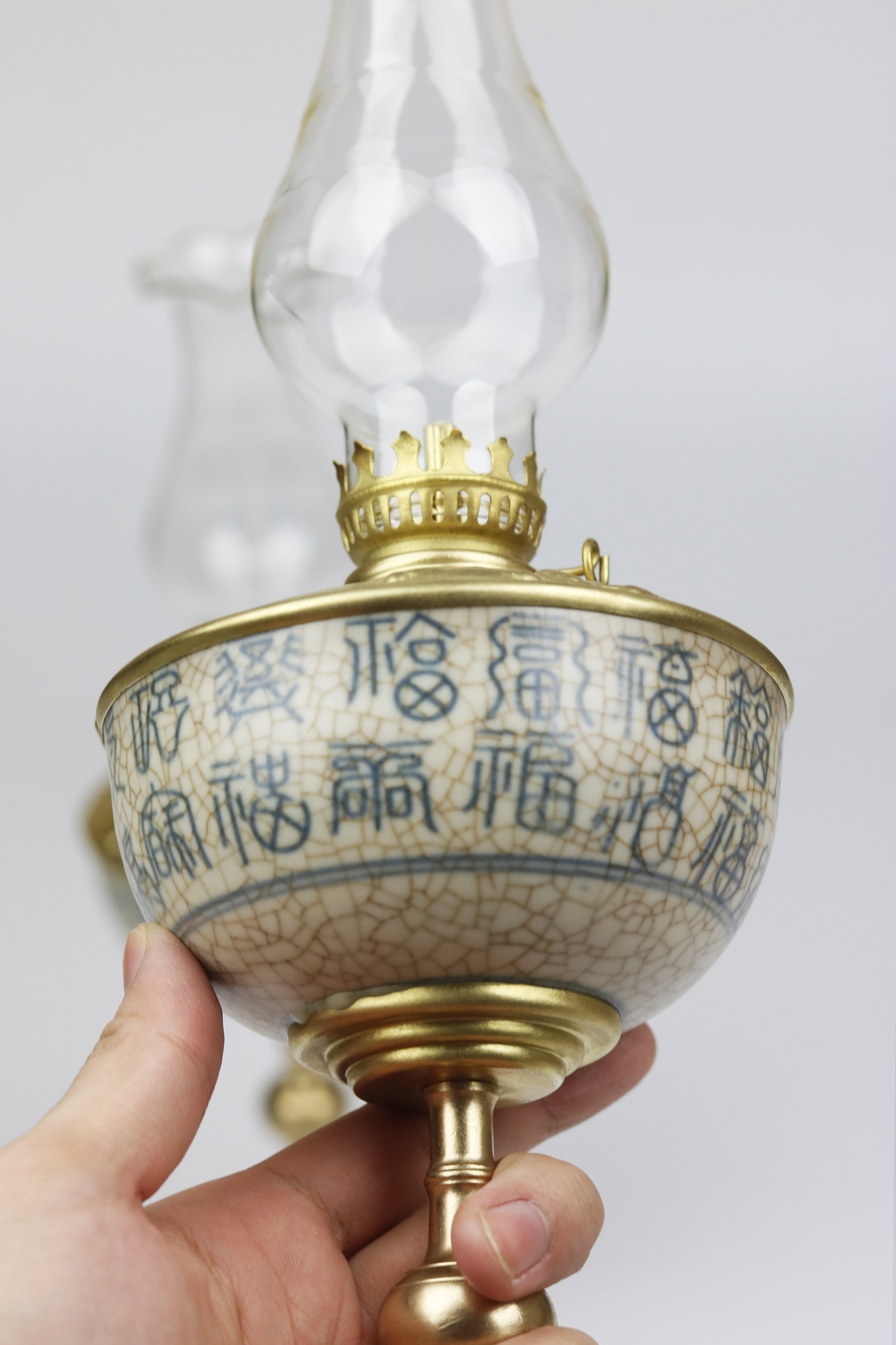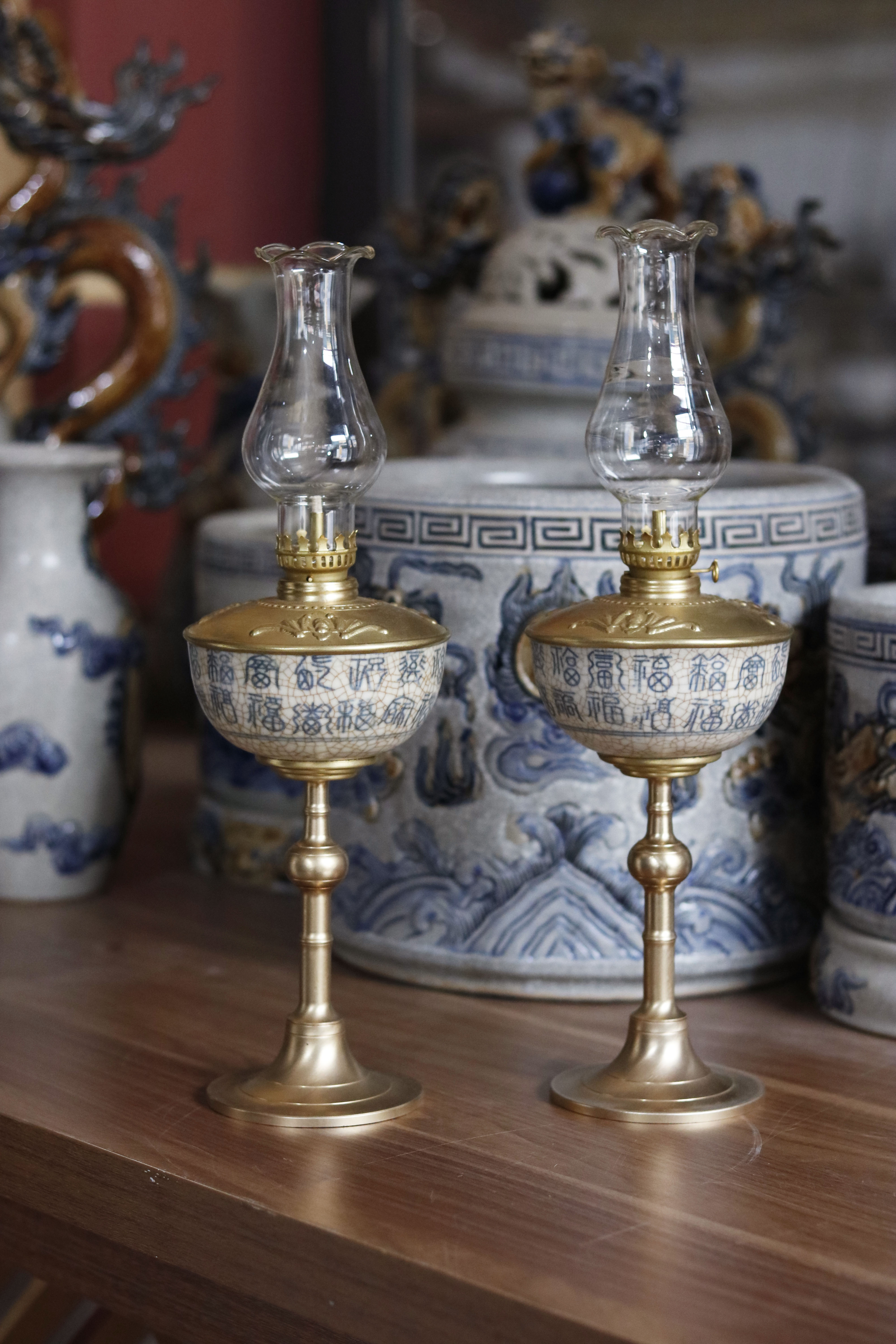 Đèn dầu men rạn chân đồng cao 37cm - Dáng đèn bầu