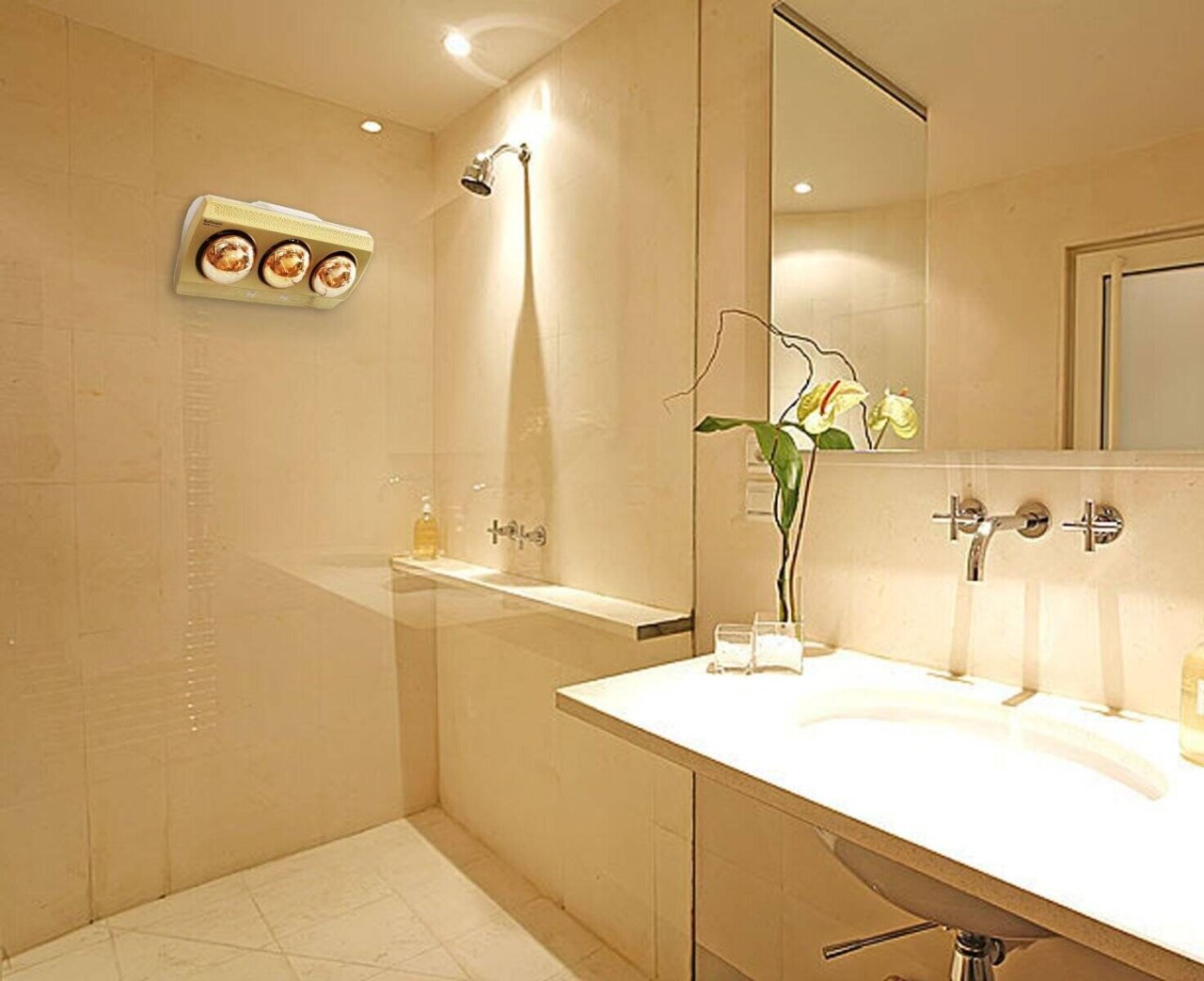 Thiết kế gọn nhẹ, tiện dụng trong không gian phòng tắm Ánh sáng bóng đèn hồng ngoại dịu nhẹ, không gây chói mắt Cấu tạo đèn là hợp kim nhôm siêu bền, cứng Bóng đèn