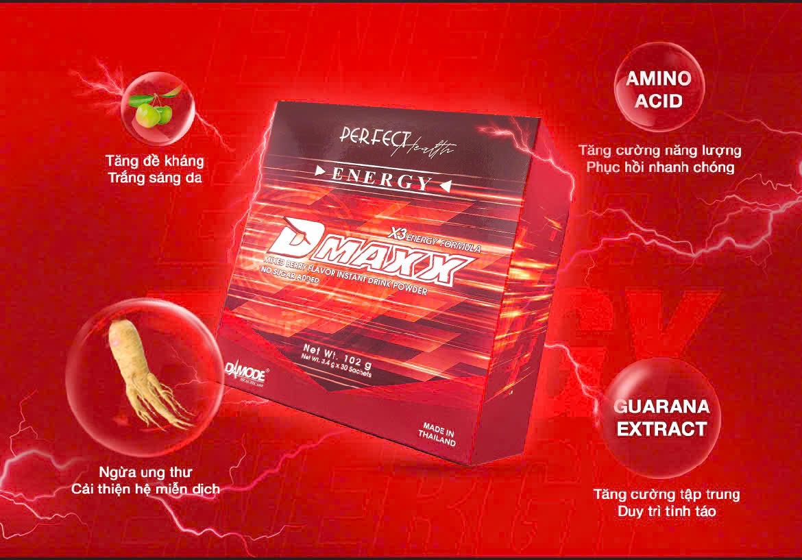 Thức uống năng lượng Dmaxx Energy Formula   Dmaxx energy formula là sản phẩm thức uống năng lượng có chức năng bổ sung năng lượng cho người uống mỗi ngày dưới dạng thức uống hòa tan. Sản phẩm có xuất xứ từ Thái Lan và đối tượng sử dụng là cả nam giới và nữ giới trong độ tuổi từ 18  tuổi. Sản phẩm là sự kết hợp từ chất được chiết suất từ trái cây thiên nhiên và hoạt chất axit hữu cơ tổng hợp. Sản phẩm có thiết kế nhỏ gọn và dễ dàng mang theo để sử dụng mỗi ngày. Đây là một trong những sản phẩm uống năng lượng được nhiều người tiêu dùng lựa chọn và tin dùng. Sản phẩm được chứng nhận và được kiểm tra lâm sàng trước khi đưa ra thị trường. Vì vậy người tiêu dùng hoàn toàn có thể yên tâm mua và sử dụng sản phẩm. Thành phần chính của Dmaxx energy formula: Thành phần của Dmaxx energy formula được kết hợp từ nhiều dưỡng chất tốt của trái cây và hoa chất axit hữu cơ tổng hợp. Các thành phần này chủ yếu là các dưỡng chất thiết yếu cần thiết cho cơ thể con người. Thành phần chính có trong Dmaxx Energy Formula gồm có: nhân sâm, cà chua, trà xanh, gừng,… Ngoài ra trong Dmaxx energy formula còn có các thành phần khác như: Sucrose, Dextrose, Malic Acid, Citric Acid Anhydrous, Guarana Extract, Tricalcium Phosphate, Mixed Berry Flavor, Sodium Chloride, Sucralose, L-Ornithine Hydrochloride, L-Arginine Hydrochloride, L-lysine Hydrochloride, Vitamin B12, Folic Acid, Ascorbic Acid,… Sản phẩm cam kết Có thành phần chiết suất 100 % từ thiên nhiên an toàn và dễ dàng sử dụng cho người sử dụng.  Công dụng của Dmaxx