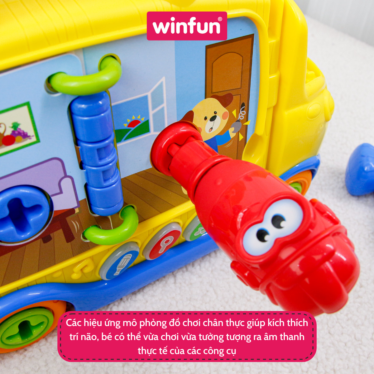 - Không chỉ các công cụ, bé còn được học thêm về các con vật và phương tiện ô tô thông qua hình dạng và 3 bức tranh sinh động Nhiều chế độ âm thanh và các hiệu ứng mô phỏng sống động giúp bé trải nghiệm y như thật