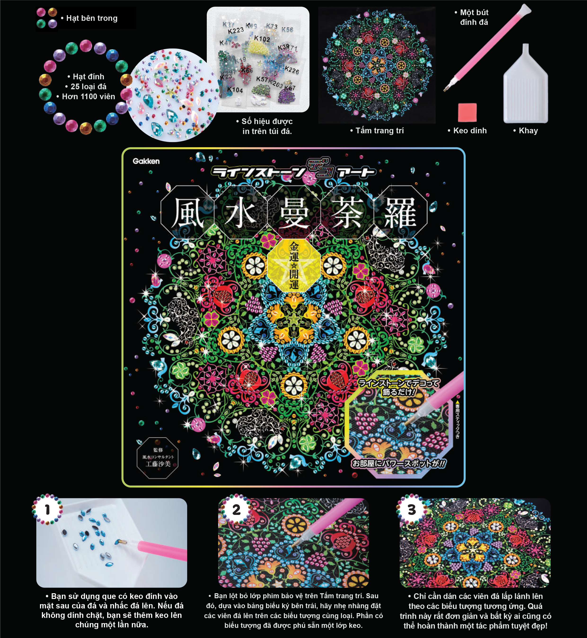 Chất liệu: Nhựa, vải, hạt màu Kích thước gói: 170 x 15 x 270 Độ tuổi: 15 tuổi trở lên Mandala là biểu tượng của vũ trụ vô tận. Nó mang lại sự êm dịu