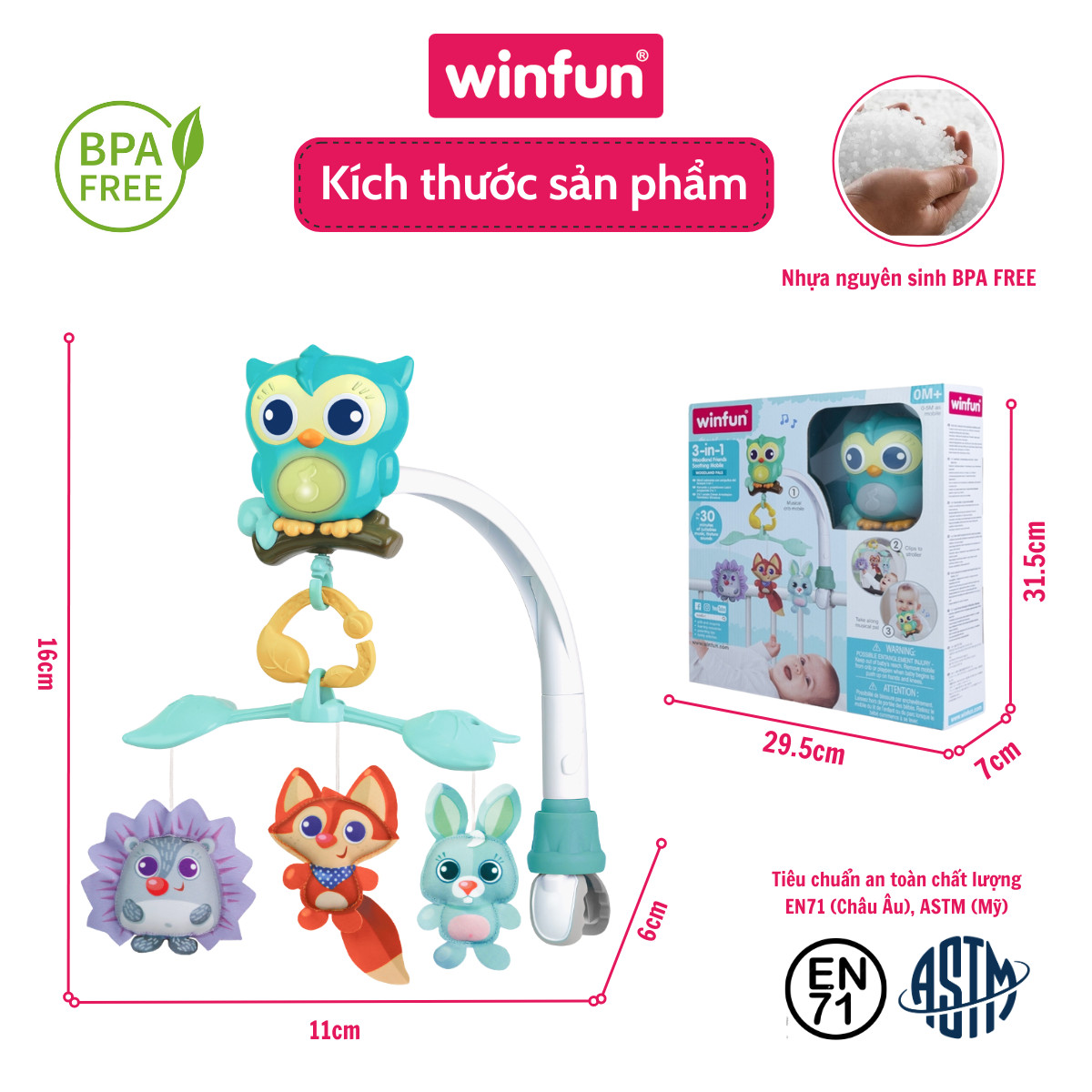 - Tên sản phẩm: Đồ chơi treo nôi cũi, xe đẩy 3 trong 1 phát nhạc ru ngủ cho bé Winfun