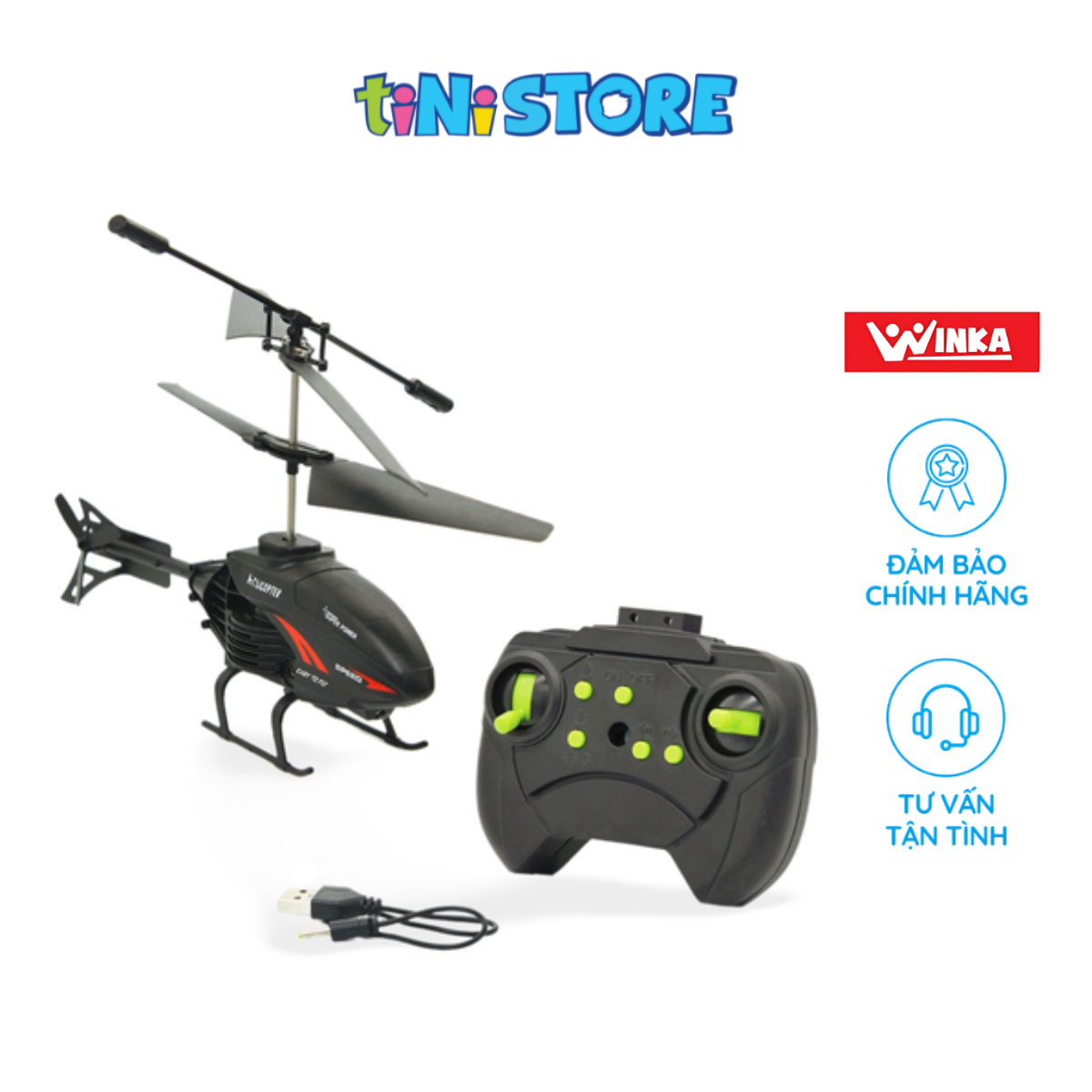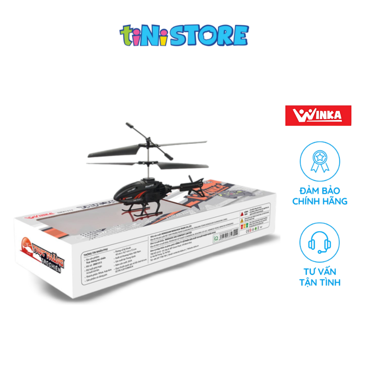 - Nơi sản xuất: Trung Quốc 10. Xuất xứ: Việt Nam ĐẶC ĐIỂM SẢN PHẨM Trực thăng tác chiến điều khiển từ xa Winka được thiết kế giống với mô hình máy bay trực thăng huấn luyện trong quân sự, với các chức năng: bay thẳng lên - hạ xuống và bay ngang theo điều khiển từ xa tần số sóng 2.4GHZ siêu mạnh, các bé sẽ nhanh chóng nhập vai trở thành một phi công điều khiển chiếc máy bay chiến đấu bảo vệ vùng trời của tổ quốc. Quá trình chơi với các bạn giúp bé học được nhiều điều bổ ích, đồng thời kích thích phát triển toàn diện các kỹ năng xử lý tình huống. Việc điều khiển máy bay giúp bé dần hình thành kỹ năng quan sát cho bé nhờ việc bé quan sát chuyển động của đồ chơi hình dạng và màu sắc của chúng. Sản phẩm không những mang đến cho bé những giây phút vui chơi thật thoải mái và vui vẻ bên bạn bè và gia đình mà còn giúp bé phát triển và hoàn thiện các kỹ năng và giác quan. TIÊU CHUẨN AN TOÀN Châu Âu: EN 71 Mỹ: ASTM Quy chuẩn quốc gia về đồ chơi trẻ em QCVN 3:2019/BKHCN. Giấy chứng nhận hợp quy số :VIC/23.HQ/9.01.0820, cấp ngày 29/08/2024. Lưu ý: Kích thước có thể chênh lệch từ 1-3cm do các phương pháp đo khác nhau Hệ thống điều khiển radio (R/C) ổn định hoạt động tốt ở khoảng dưới 100m.
