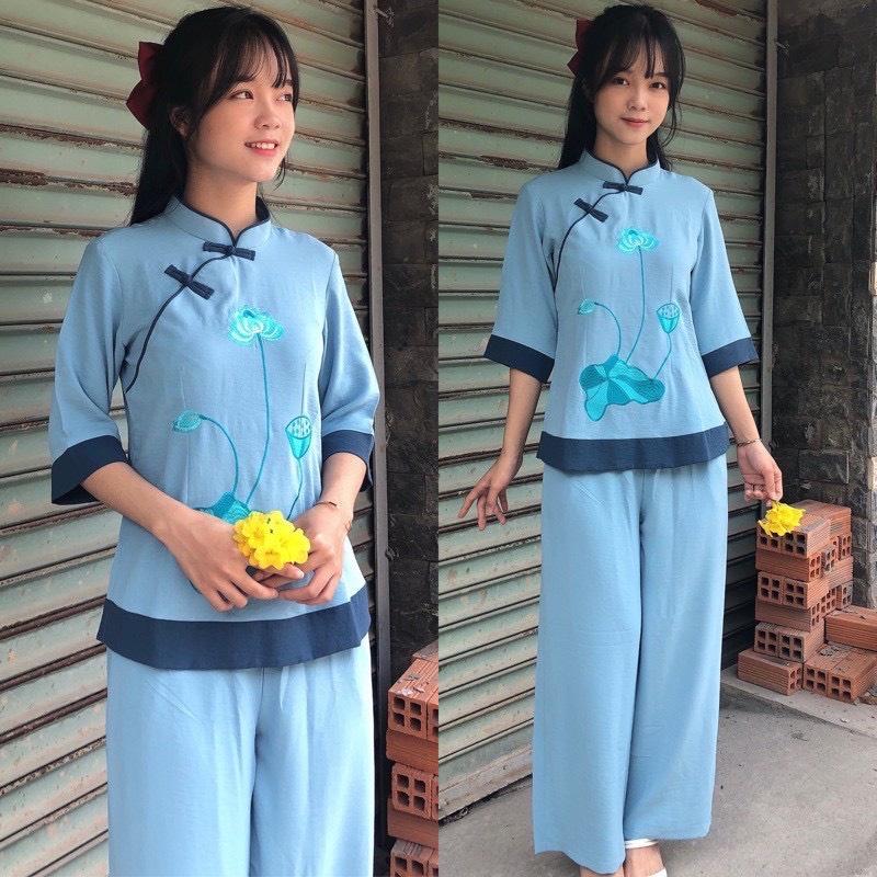 [ FREE SHIP ] Bộ đồ lam đi chùa nữ thêu sen chất liệu đũi thái, Pháp phục lễ chùa cổ tàu phối
