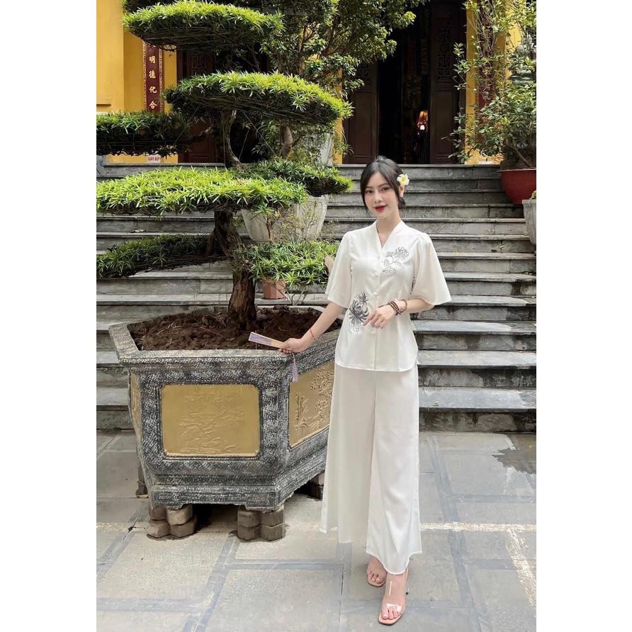 Quần áo phật tử, đồ lam đi chùa mẫu thêu hoa cúc vải tơ A78