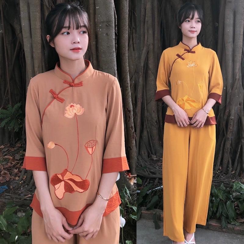SIÊU PHẨM pháp phục nữ vải đũi lụa thêu sen cao cấp - quần áo lam đi lễ chùa chính hãng SEN HỒNG