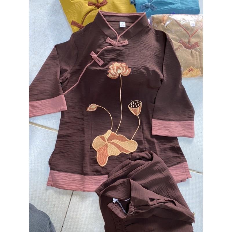 SIÊU PHẨM pháp phục nữ vải đũi lụa thêu sen cao cấp - quần áo lam đi lễ chùa chính hãng SEN HỒNG