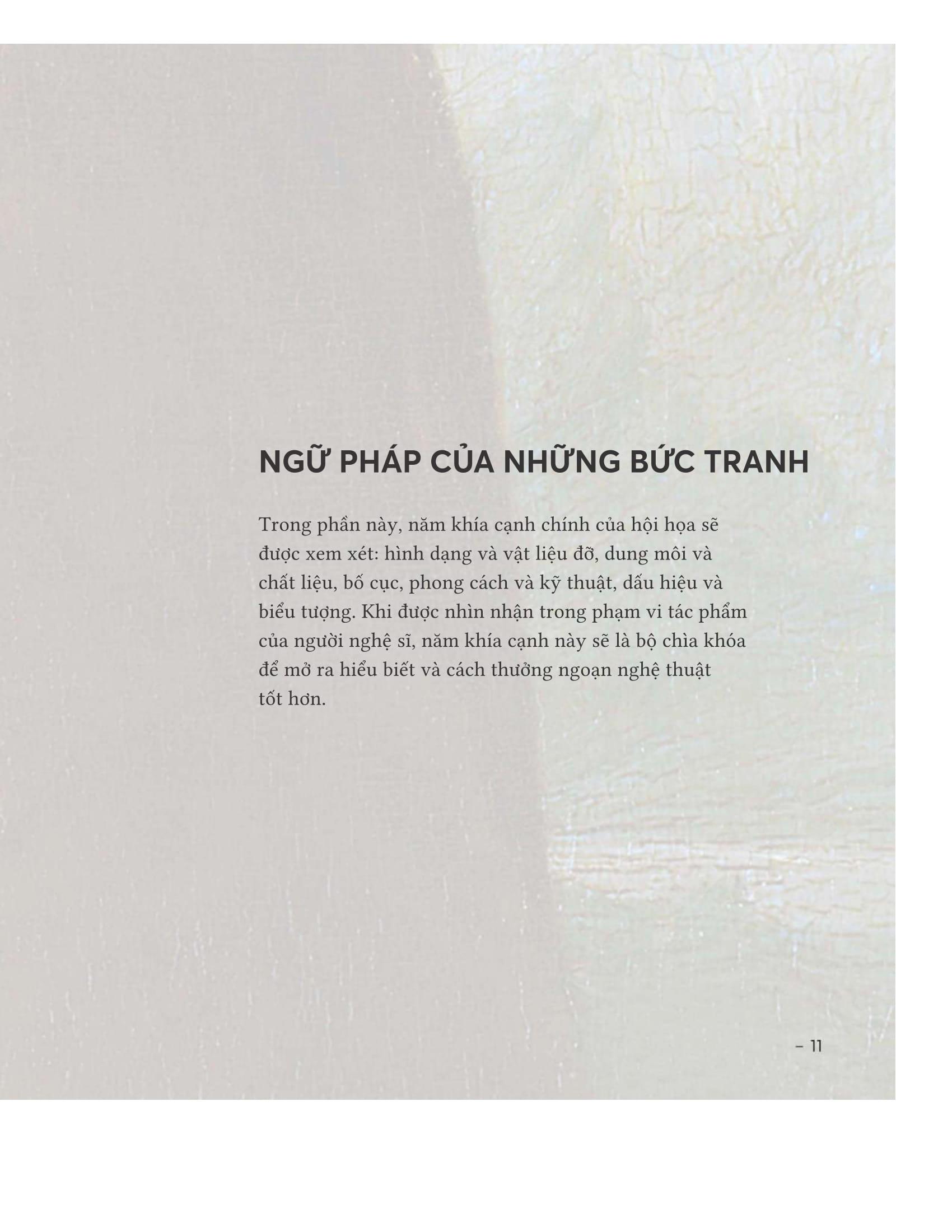 Ngữ pháp của những bức tranh: Phân tích năm yếu tố cấu thành tác phẩm, bao gồm: hình dạng và vật liệu đỡ, dung môi và chất liệu, bố cục, phong cách và kỹ thuật, ký hiệu và biểu tượng. Đồng thời trong phần này còn có một mục phân tích về người họa sĩ – cá nhân sáng tạo ra tác phẩm.
