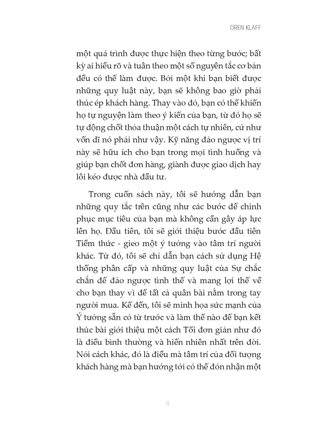 Oren Klaff là một trong những chuyên gia hàng đầu thế giới về bán hàng, huy động vốn và đàm phán. Cuốn sách đầu tiên của ông, Pitch Anything, được in hơn 1.000.000 bản trên toàn thế giới. Ông viết cho Harvard Business Review, Inc., Advertising Age, Entrepreneur và xuất hiện trên hàng trăm tạp chí, podcast và blog. Ông cũng là đối tác đầu tư trong quỹ đầu tư cổ phần tư nhân trị giá 200 triệu đô la.