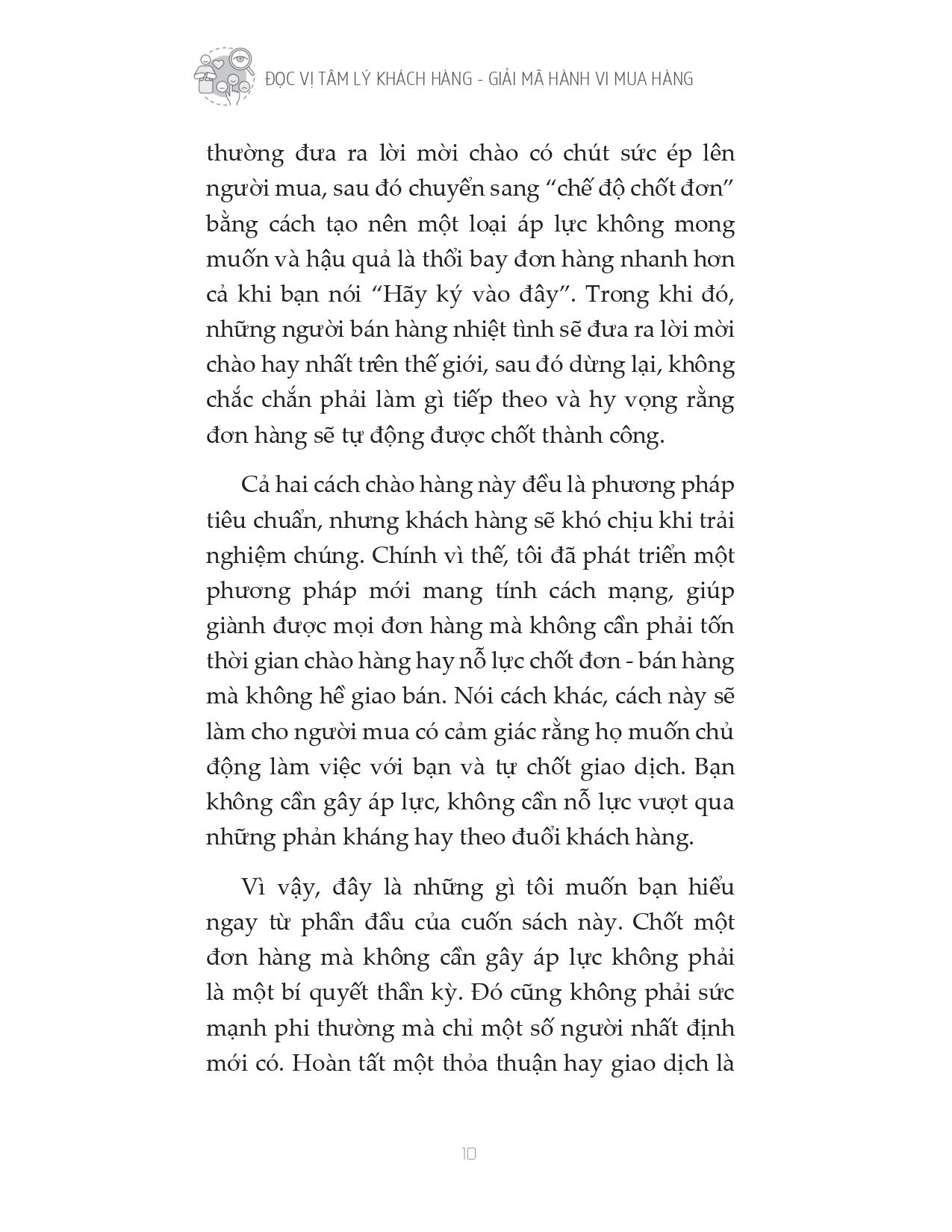 Cuốn sách “Đọc vị tâm lý khách hàng - Giải mã hành vi mua hàng” cung cấp cho bạn phương pháp bán hàng hoàn toàn mới, không chèo kéo, không gây áp lực, giúp bạn có thể bán bất kỳ thứ gì cho bất kỳ ai. Trọng tâm của cuốn sách nằm ở phương pháp gieo một ý tưởng vào tâm trí người khác, biến ý tưởng của bạn thành của người mua. Tác giả Oren hướng dẫn bạn những quy tắc “bí quyết kinh doanh” - để làm được điều đó cũng như các bước để chinh phục mục tiêu của bạn mà không cần gây áp lực lên họ. Cuốn sách này chính là chìa khóa giúp bạn “lật ngược thế cờ”, một “game changer” thực sự.