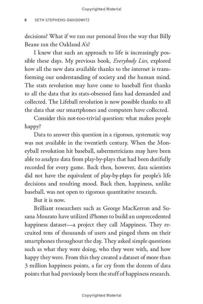 Telling fascinating, unexpected stories with these numbers and the latest big data research, Stephens-Davidowitz exposes that, while we often think we know how to better ourselves, the numbers disagree. Hard facts and figures consistently contradict our instincts and demonstrate self-help that actually works—whether it involves the best time in life to start a business or how happy it actually makes us to skip a friend’s birthday party for a night of Netflix on the couch. From the boring careers that produce the most wealth, to the old-school, data-backed relationship advice so well-worn it’s become a literal joke, he unearths the startling conclusions that the right data can teach us about who we are and what will make our lives better.