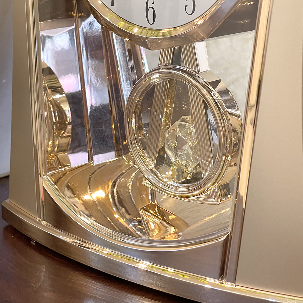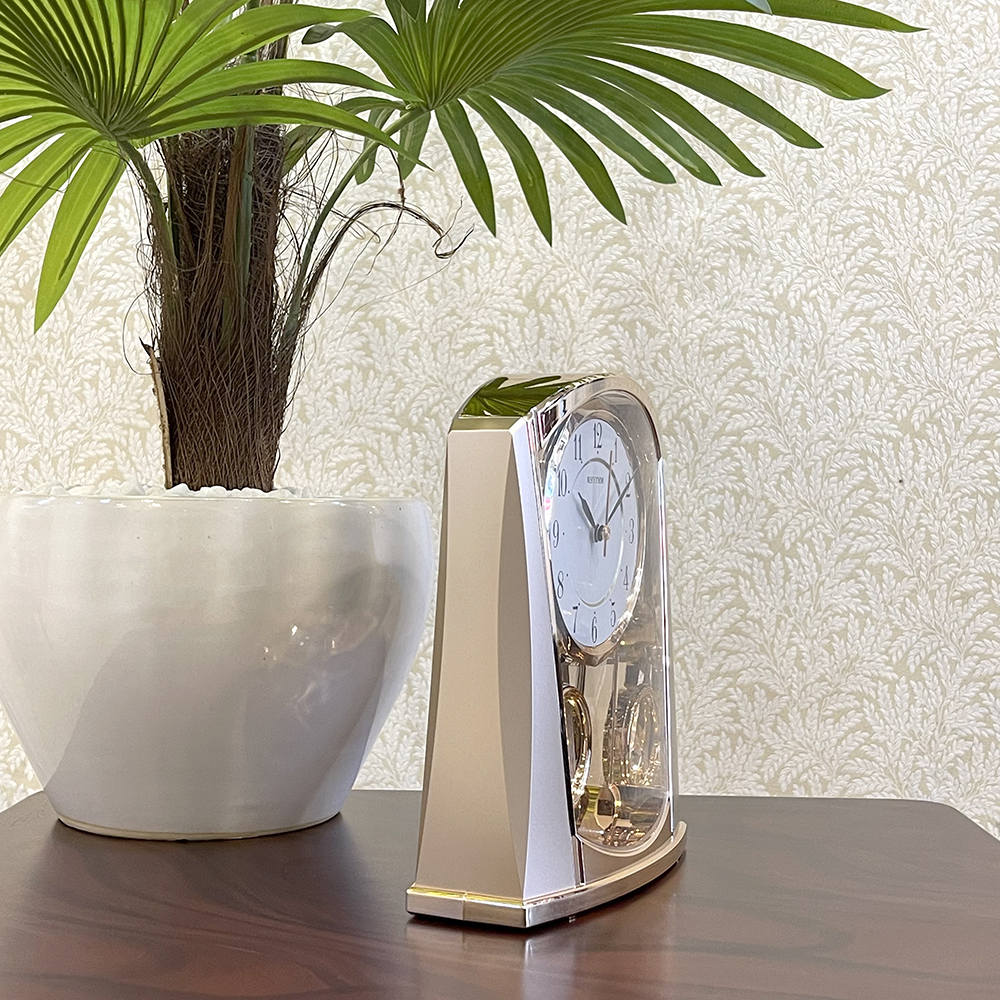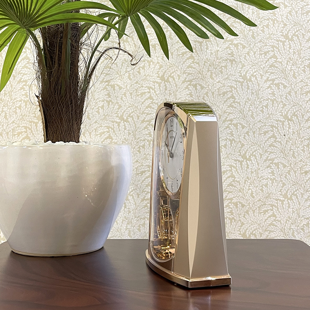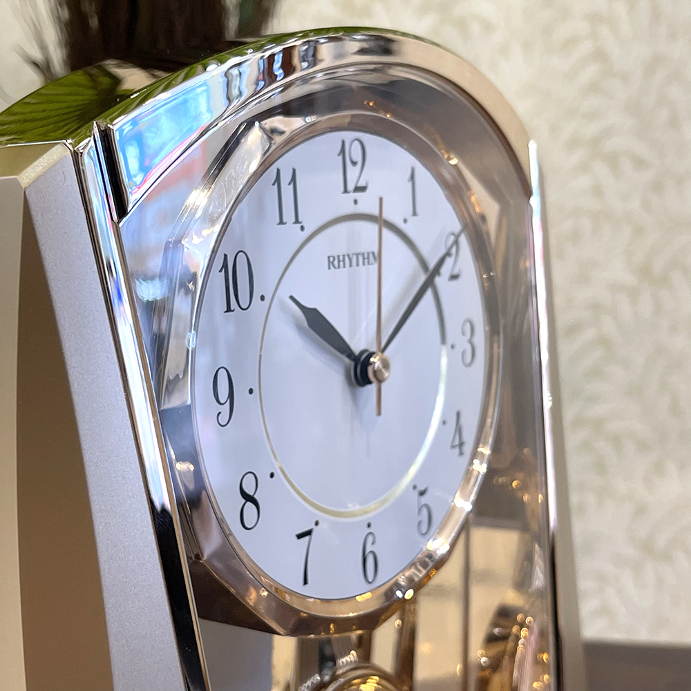 Đồng hồ để bàn Nhật Bản Rhythm 4RP796WS18, dùng pin (AAx2), vỏ nhựa cao cấp mạ vàng kết hợp mica trong suốt nhìn xuyên thấu, Kích thước 14.0 x 22.8 x 8.3cm, trọng lượng 390g. Quả