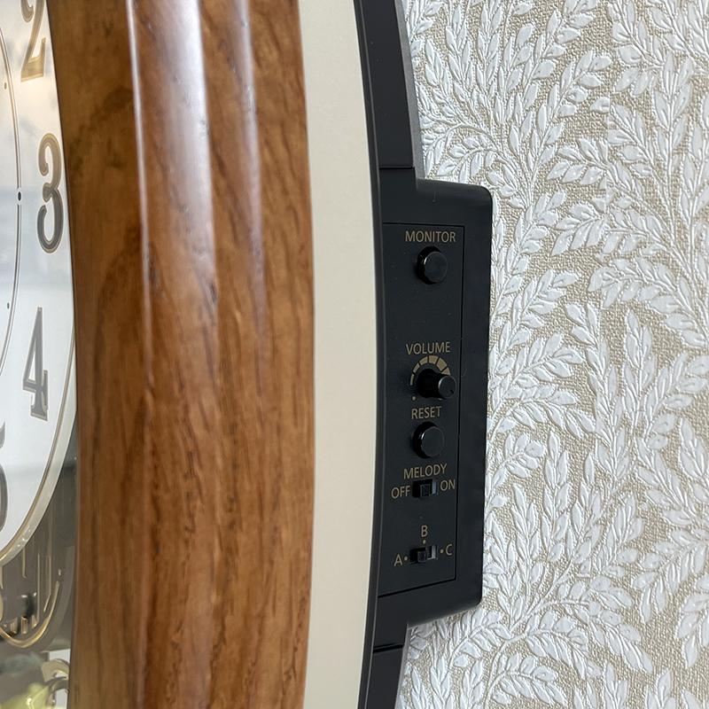 Mua tại TiktokĐồng hồ treo tường Rhythm Magic Motion 4MH414WR06, dùng 2 pin (D ). Vỏ gỗ màu nâu, Kích thước 42.2 x 53.8 x 11.6cm, trọng lượng 3.88kg. Âm thanh thính phòng SIP ( Sound In Place ) đạc sắc độc quyền của Rhythm Japan với 3 chọn lựa chế độ phát nhạc gồm : 12 bản nhạc cổ điển A / 12 bản nhạc B (12 + 12 Melodies) / 6 bản giáng sinh ( 6 X-mas Songs). Mắt Cảm ứng ánh sáng tự động ngưng phát nhạc khi thiếu sáng. Nút chỉnh âm lượng tiện lợi. Cụm Quả lắc cẩn đá pha lê. Lắp ráp tại Trung Quốc.