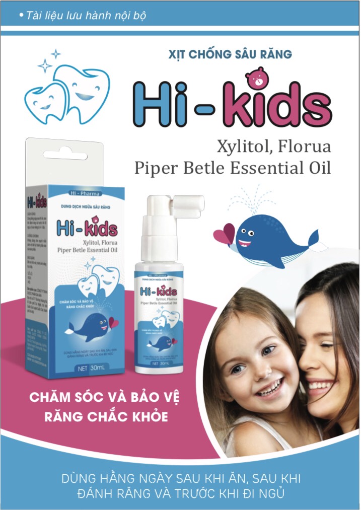Mua tại TiktokThông tin chung (gốc) Xịt chống sâu răng Hi- Kids với công thức tối ưu mang lại hiệu quả cao. Thành phần : Xylitol, Flos Chrysanthe-mi Flower Extract ( Chiết xuất hoa cúc ) ; Cinnamomum Camphora; Essential Oil ( Tinh dầu Long não ) Ocimum Gratissimum Essential Oil ( Tinh dầu hương nhu); Piper bettle Essential Oil ( tinh dầu lá trầu không ) ; Thymus vulgaris Essential oil ( tinh dầu xạ hương ) ; PEG 40 hydrogenated castor oil; Natri florua ; Sodium chlorid; acid citric monohydrate; Glycerin; Propylene Sản phẩm được nghiên cứu chuyên sâu , có tác dụng hữu dụng, rất dể sử dụng cho trẻ nhỏ . Đặc biệt với sự kết hợp của Xylitol, Florua và chiết xuất từ lá trầu không , giúp sát khuẩn , ức chế virus gây hại cho răng miệng . Chỉ định