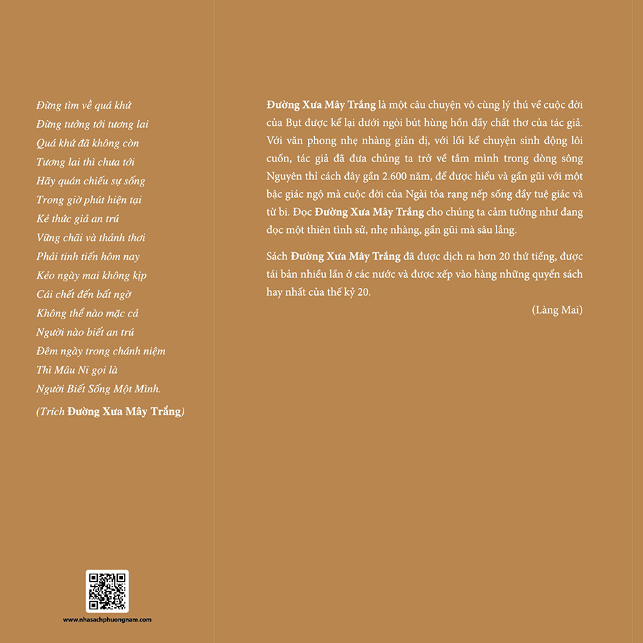 Đường Xưa Mây Trắng là một câu chuyện vô cùng lý thú về cuộc đời của Bụt được kể lại dưới ngòi bút hùng hồn đầy chất thơ của tác giả. Với văn phong nhẹ nhàng giản dị, với lối kể chuyện sinh động lôi cuốn, tác giả đã đưa chúng ta trở về tắm mình trong dòng sông Nguyên thỉ cách đây gần 2.600 năm, để được hiểu và gần gũi với một bậc giác ngộ mà cuộc đời của Ngài tỏa rạng nếp sống đầy tuệ giác và từ bi. Đọc Đường Xưa Mây Trắng cho chúng ta cảm tưởng như đang đọc một thiên tình sử, nhẹ nhàng, gần gũi mà sâu lắng.