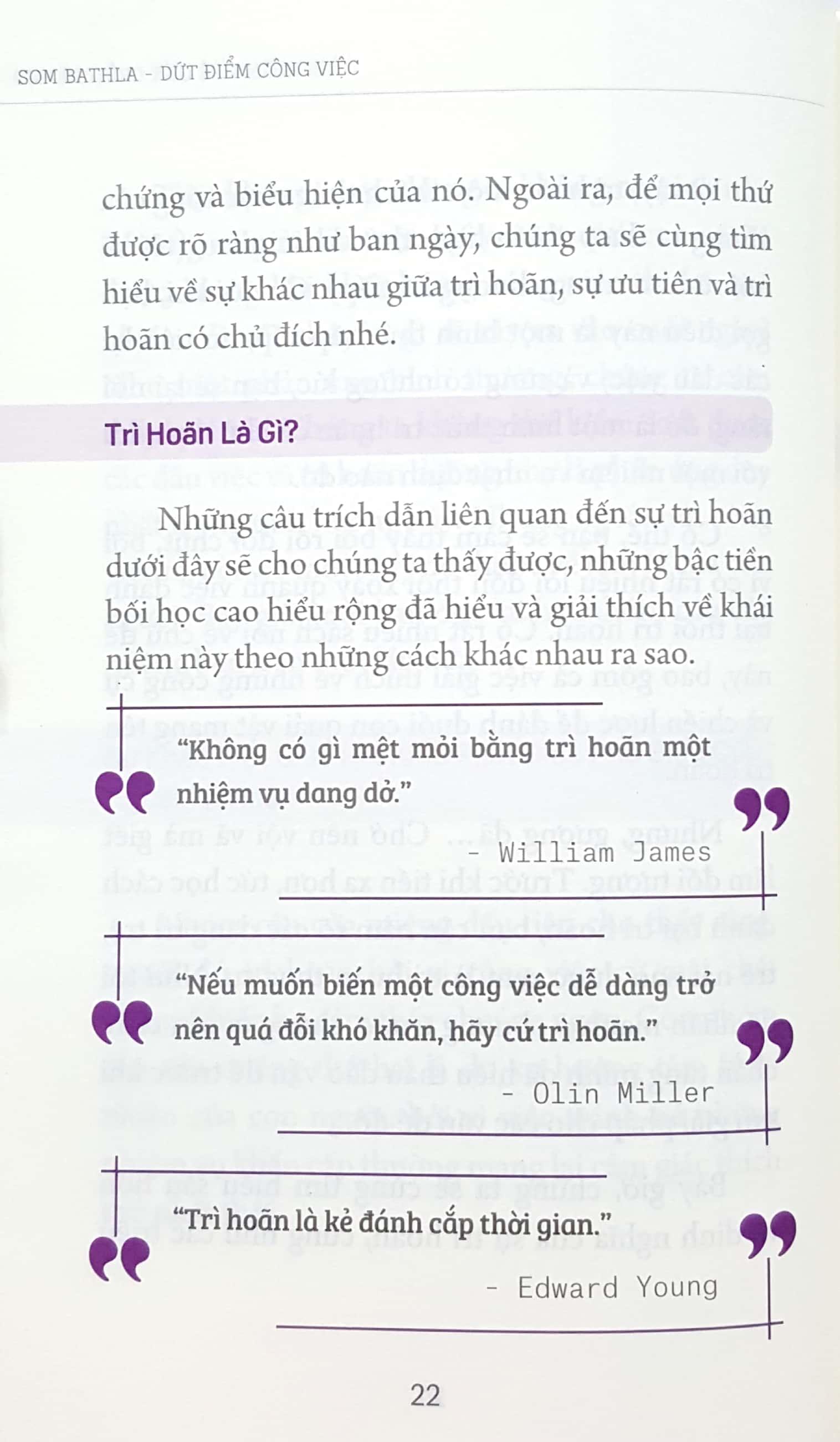 “Chẳng thể nào tìm lại thời gian đã mất.” - Benjamin Franklin Bằng ngòi bút tinh tế và giọng văn hóm hỉnh, Som Bathla vạch trần những lý do, lối suy nghĩ dẫn chúng ta đến với sự trì hoãn; phân biệt những nhầm lẫn có thể có giữa sự trì hoãn vô hại và có hại; và quan trọng hơn, ông còn đề ra tậ 27 cách để khắc phục thói quen trì hoãn. Hy vọng, bạn đọc sẽ tìm được chiến lược đối phó với một trong những con quái vật dữ tợn nhất của thế giới hiện đại, sự Trì Hoãn. “Quyển sách này quả thực là một phương thuốc dành cho những độc giả đang gặp khó khăn với thói trì hoãn và mang đến những hướng dẫn tuyệt diệu của Som Bathla về cách thức tự tạo động lực. Đúng là một quyển sách đáng đọc!” – Khushi Parmar, độc giả trên Amazon.
